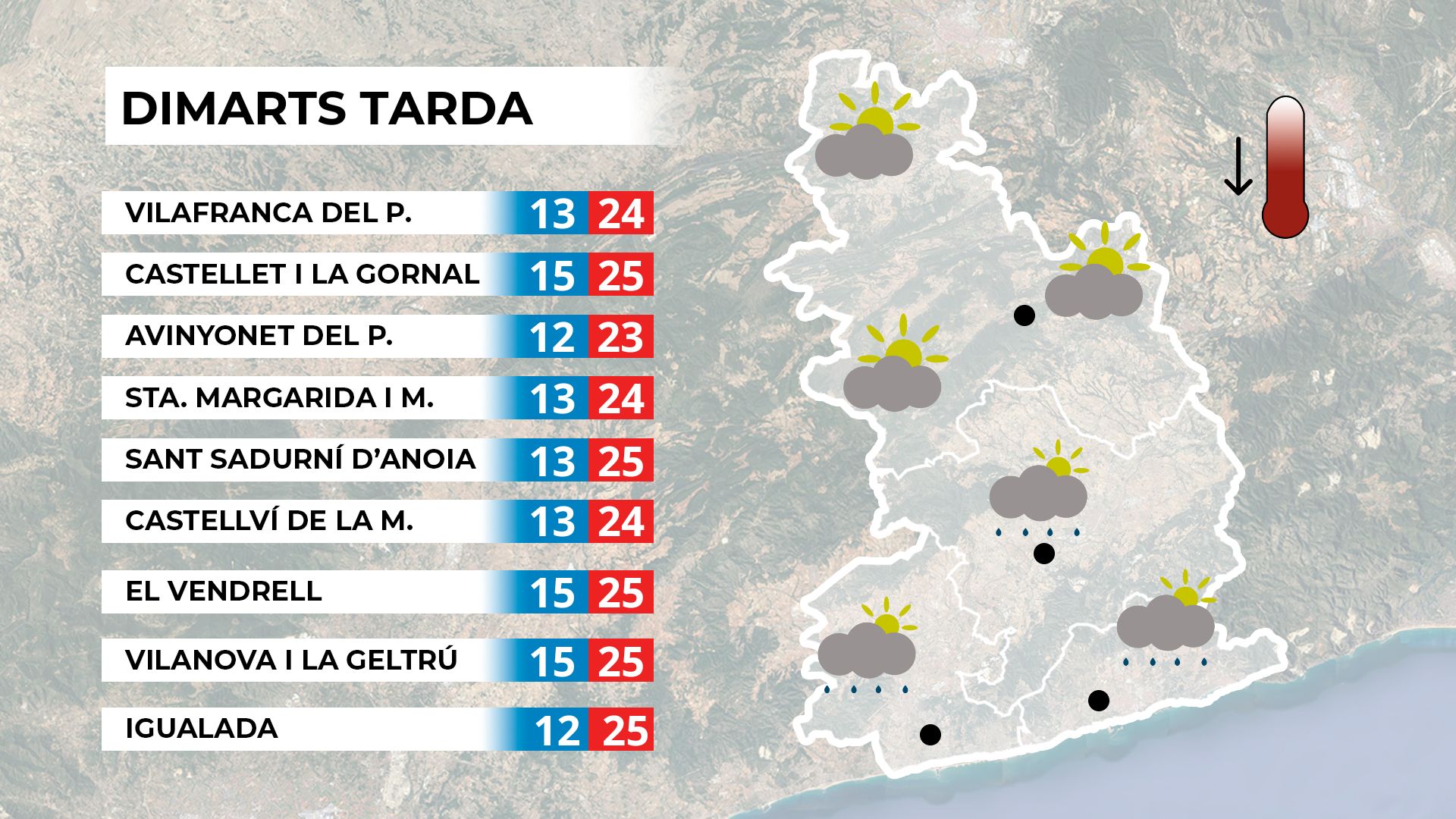 L’estiu es va acomiadant i la tardor de mica en mica es va imposant. Després d’un dilluns molt suau i assolellat, aquest dimarts les temperatures tornaran a baixar les nuvolades començaran a guanyar terreny. Fins al migdia, però, la calma serà encara la protagonista, amb força ullades de sol i quatre núvols prims. A partir de la tarda i, especialment, al vespre, el cel s’anirà tapant i entraran les primeres precipitacions.