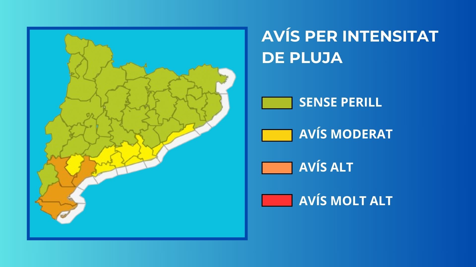Mapa d’avisos per intensitat de pluja per a dimarts al vespre i dimecres.