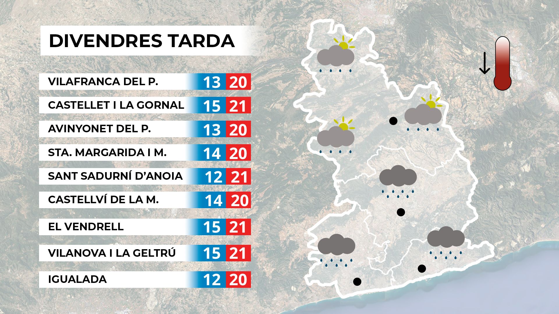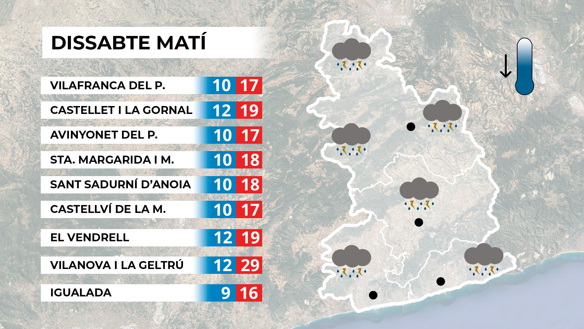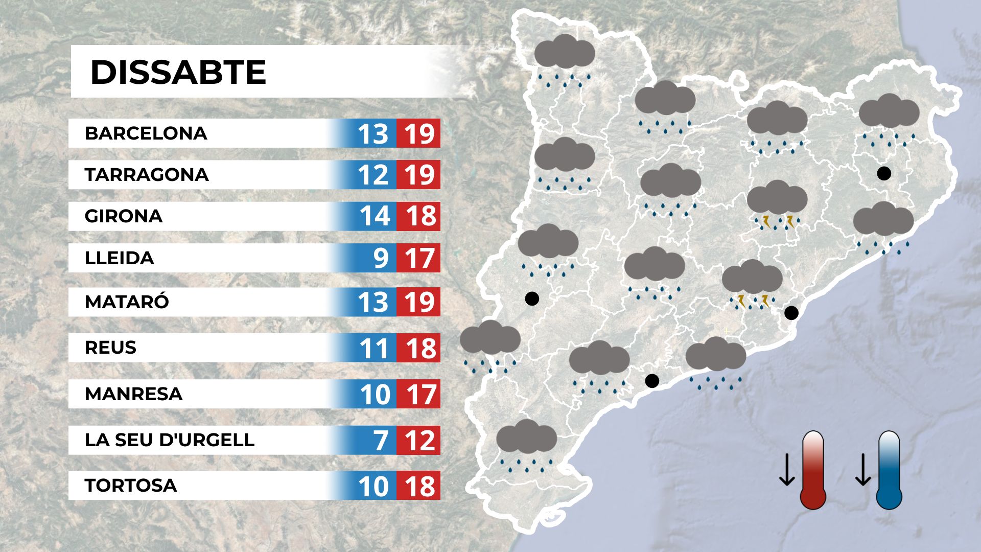 A més, les pluges continuaran, com a mínim, fins al migdia, quan la part més intensa de la borrasca tendirà a desplaçar-se cap al nord-est. Al vespre no es descarta algun ruixat, però el protagonista serà el termòmetre, ja que la nit i matinada seran fredes.