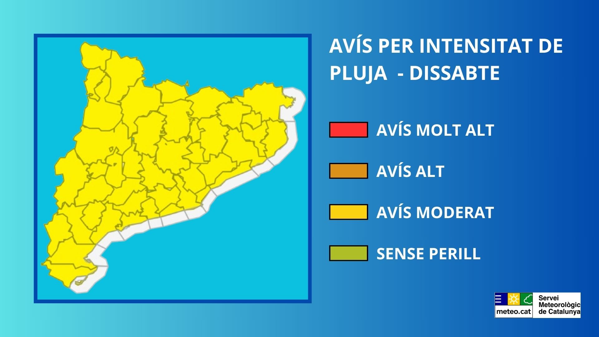 Per tota aquesta situació, el Servei Meteorològic de Catalunya ja ha emès avisos per intensitat de pluja. Tot el país es troba en avís moderat (groc), i és que poden caure més de 20 litres en menys de mitja hora. Al mateix temps, des de Protecció Civil es demana extremar les precaucions i evitar apropar-se a rieres, rierols o zones fàcilment inundables, ja que es poden acumular més de 60 litres al final de la jornada en alguns indrets.