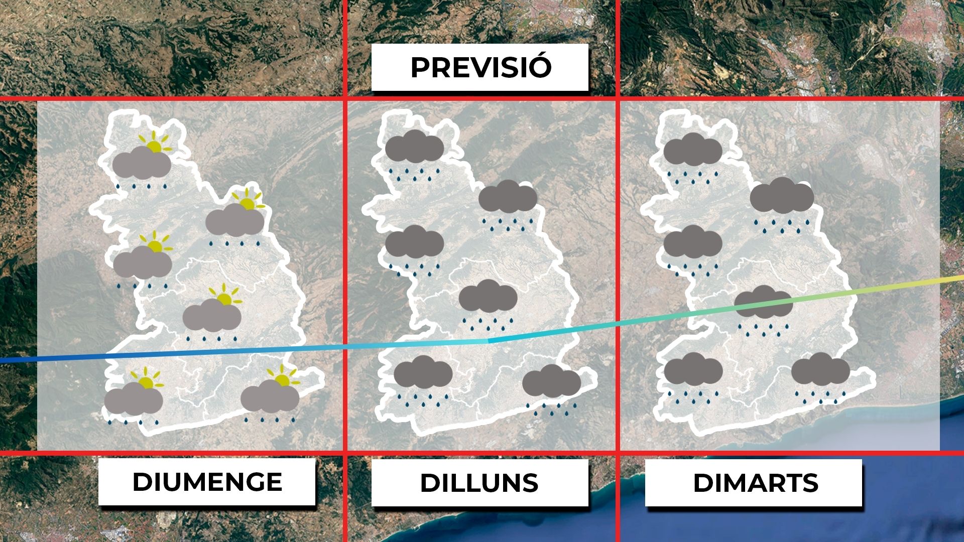 Diumenge el temps no acabarà de fer net. Podrà ploure a qualsevol hora del dia, sobretot a partir de la tarda. Al matí s’obriran algunes tímides clarianes, però el cel serà força amenaçador.