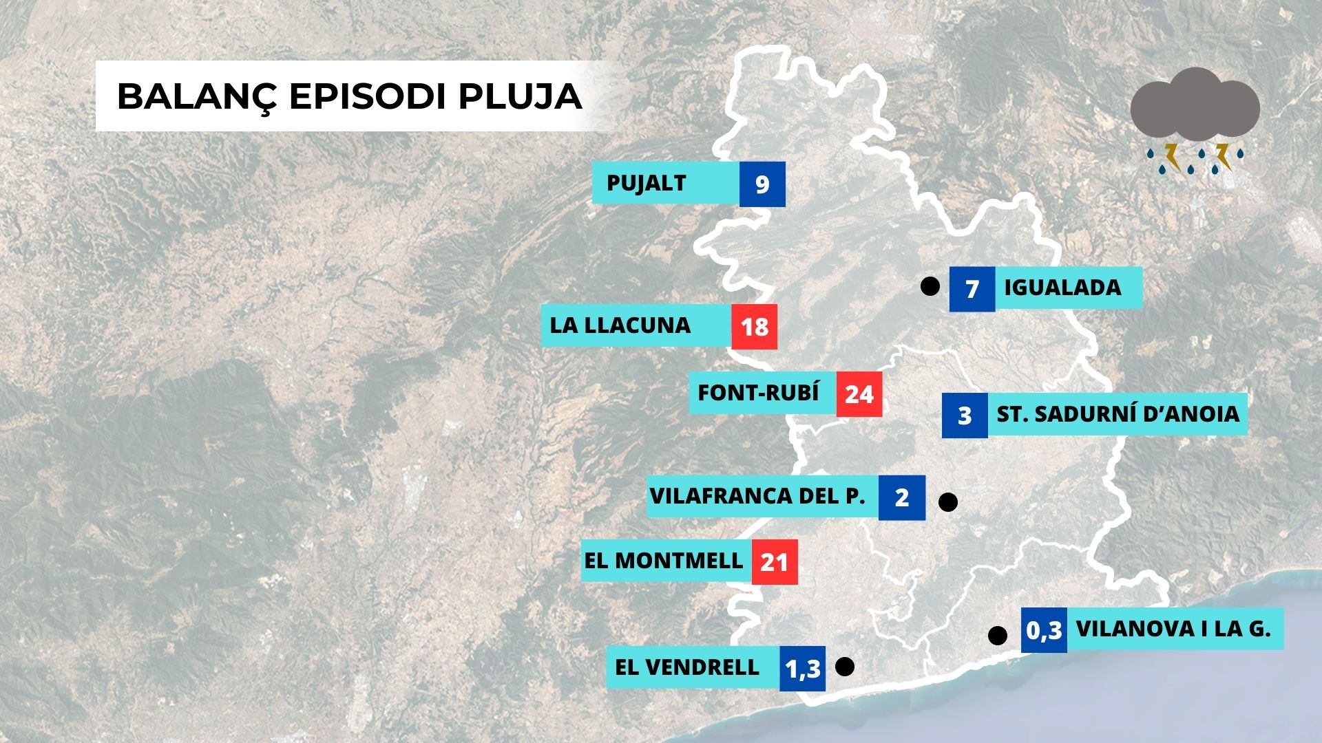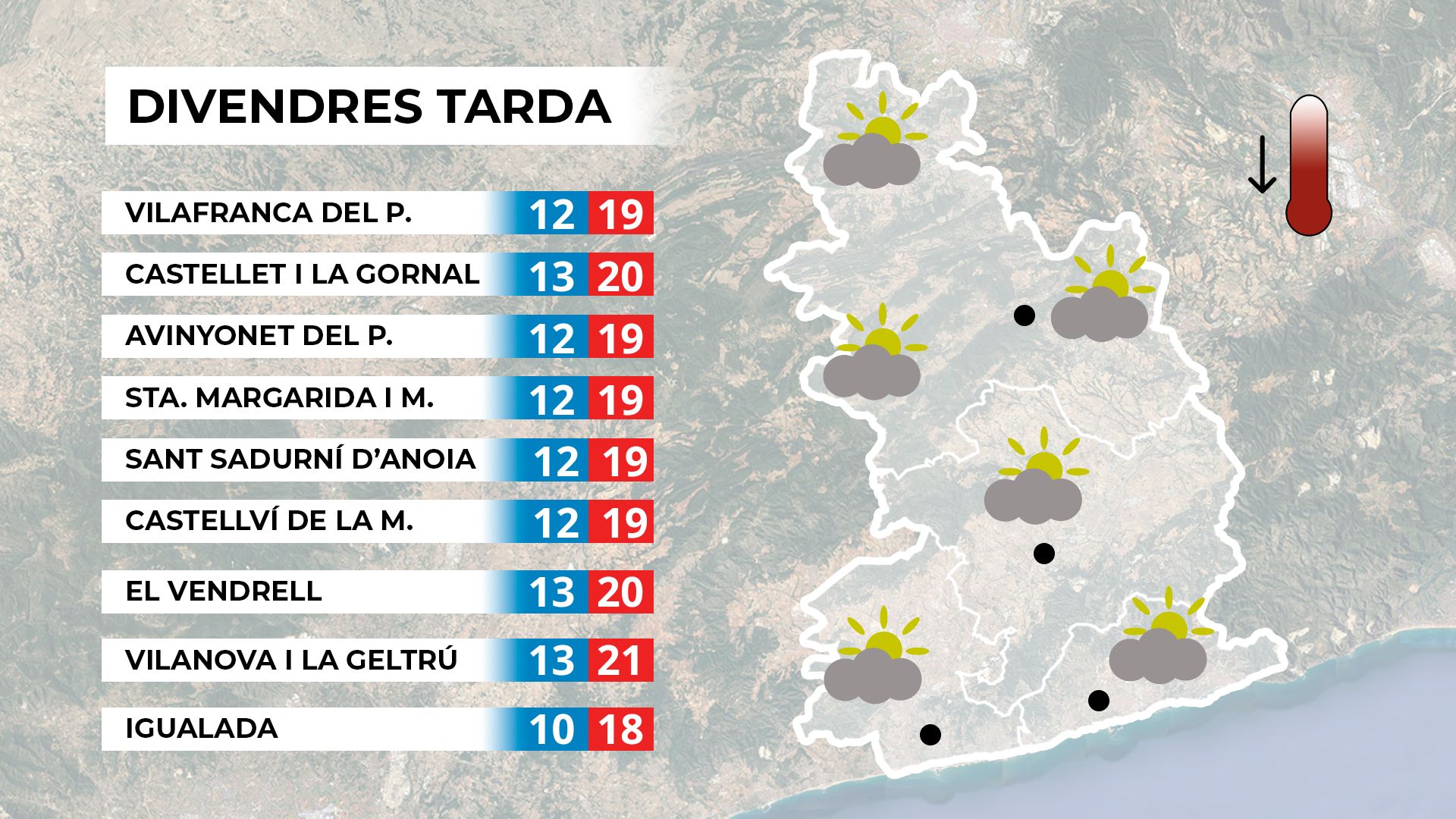 Després d’un dijous amb pluges disperses però intenses, que van deixar més de 24 litres per metre quadrat en menys de mitja hora a llocs com Torrelles de Foix, Sant Martí Sarroca o Sant Quintí de Mediona, avui divendres ens despertem amb alguns núvols però majoritàriament amb sol i temperatures més fresques. El canvi de temps d’ahir va portar una baixada de temperatures, que es mantindran fresques durant el cap de setmana.