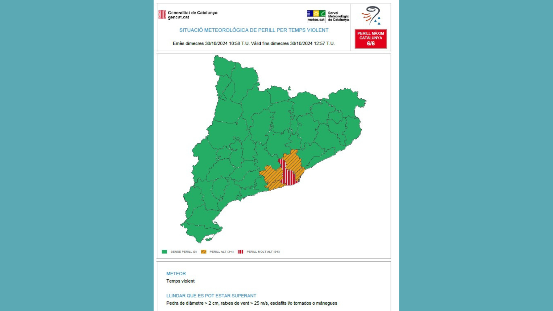 L’avís parla de possibilitat de pedra de fins a 2 centímetres, ratxes de vent de 25 metres per segon, esclafits i tornados o mànegues.