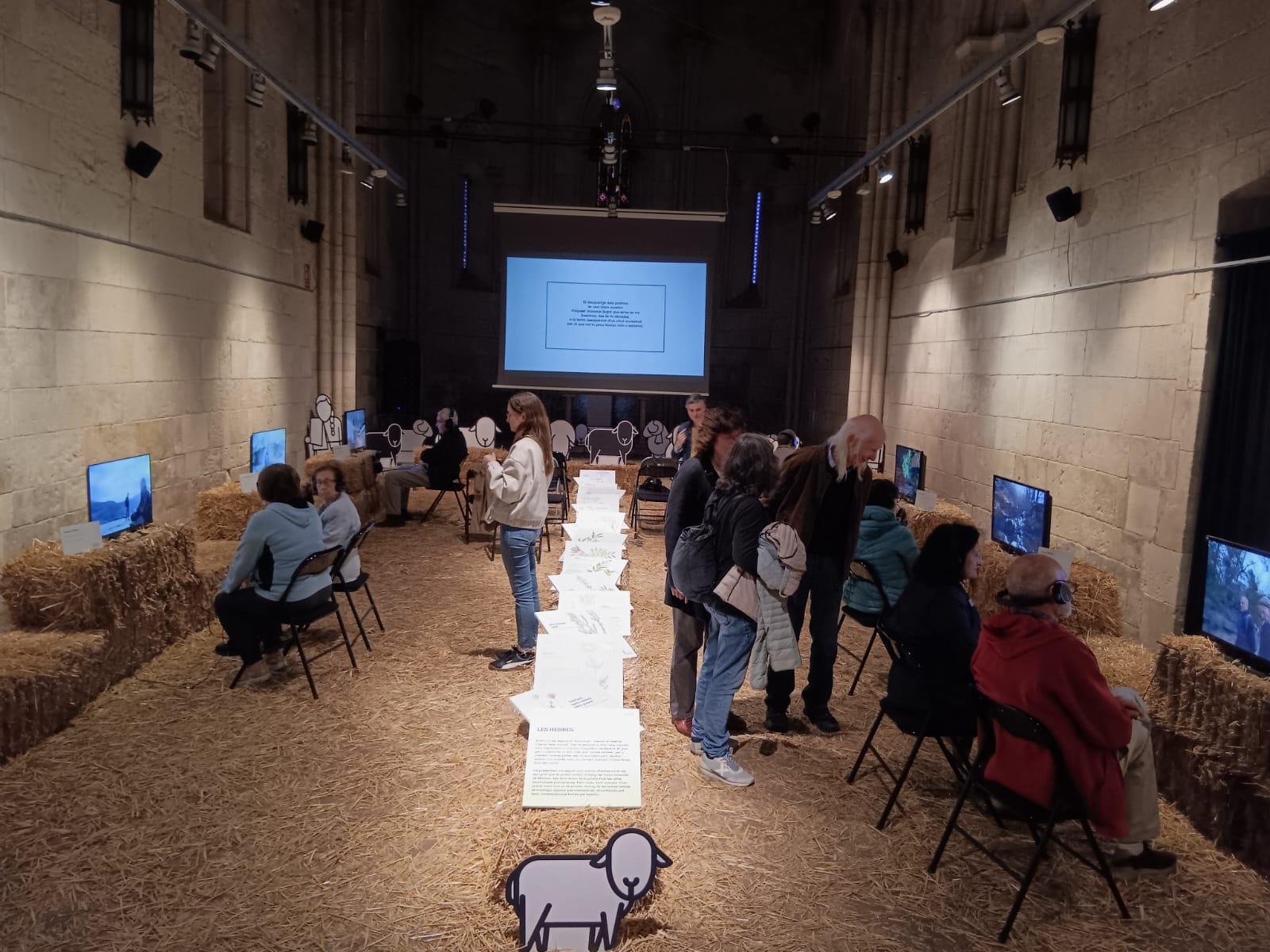 L’exposició inclou 11 audiovisuals, destacant un vídeo central que presenta el passat ramader i la complexitat dels ramats, amb sons naturals de fons. Els altres 10 vídeos es poden veure en monitors i escolar amb auriculars. En ells diversos pastors reflexionen sobre la seva feina. La durada aproximada de cada audiovisual és d’entre 6 i 8 minuts. A més, unes 16 il·lustracions mostren herbes apreciades pel ramat, subratllant la constant cerca d’aliment. També es pot observar com la superfície està recoberta de palla.