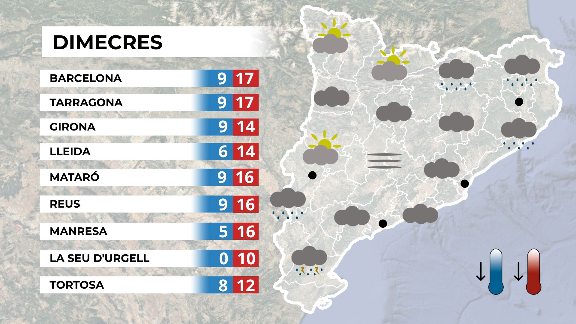 Dimecres, el que podem assegurar és que l’arribada d’aire fred farà que la temperatura continuï baixant, amb màximes més moderades i una sensació de fresca durant tot el dia. On hi ha dubtes és en les precipitacions. Segons els mapes actuals, es preveu que les pluges es mantinguin, però no amb la intensitat i abundància que s’apuntava ahir. Per això, caldrà estar pendents de les properes actualitzacions.