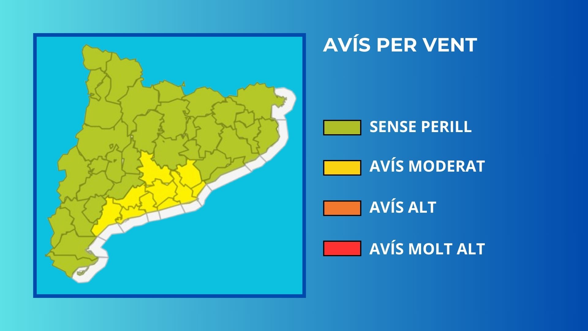 Mapa d’avisos per vent segons el Meteocat.