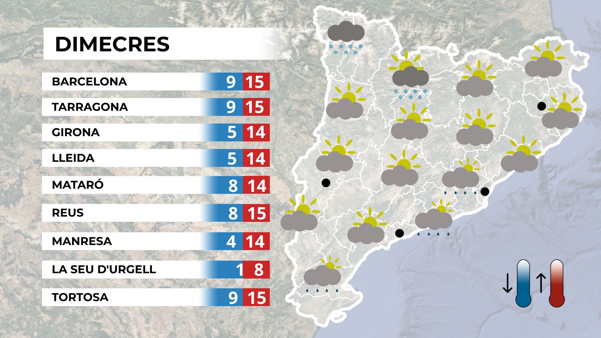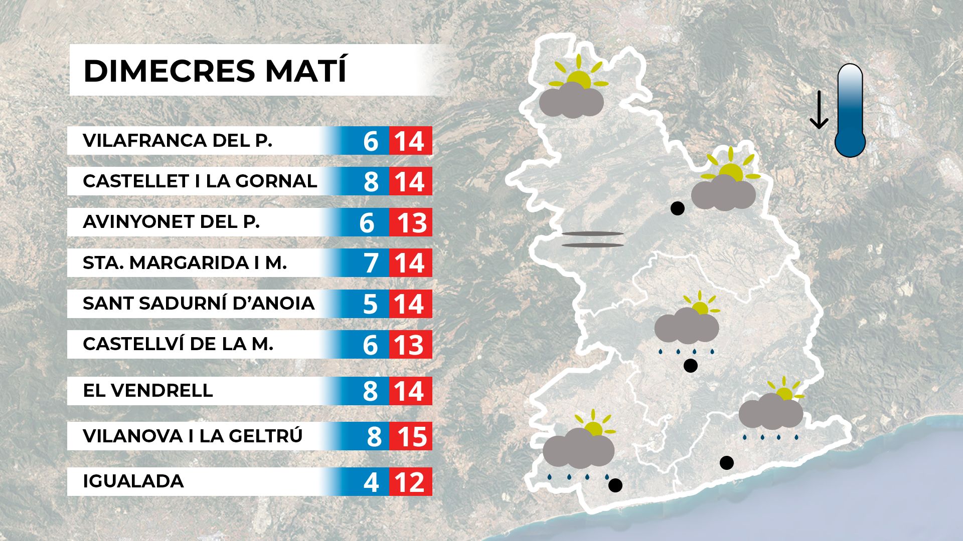 Dijous serà la jornada més freda de la setmana, amb els termòmetres tocant fons. L’ambient serà hivernal i contrastarà amb la suavitat del cap de setmana passat. Al matí, el cel es presentarà tapat i podrien aparèixer algunes boirines, que accentuaran encara més la sensació de fredor. A partir de la tarda, el sol guanyarà terreny amb l’aparició d’alguns núvols prims.