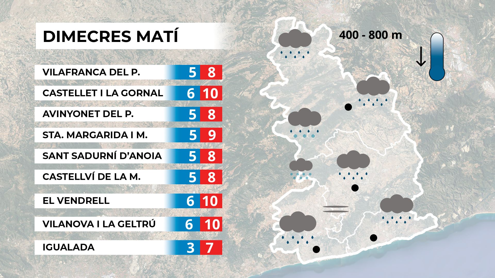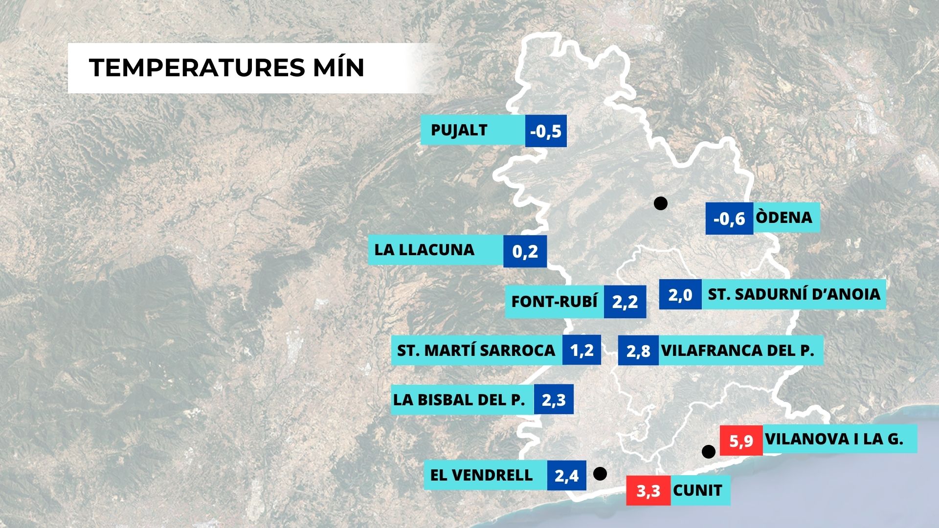 Avui hem començat el dia amb temperatures gèlides, per sota dels 3 graus en moltes zones del país. L’ambient fred es fa notar, i els termòmetres han registrat mínimes destacades: 2,8 graus a Vilafranca del Penedès o 2 graus a Sant Sadurní d’Anoia. A les zones costaneres, les mínimes també han estat marcades, amb 3 graus al Vendrell i 5,9 graus a Vilanova i la Geltrú.