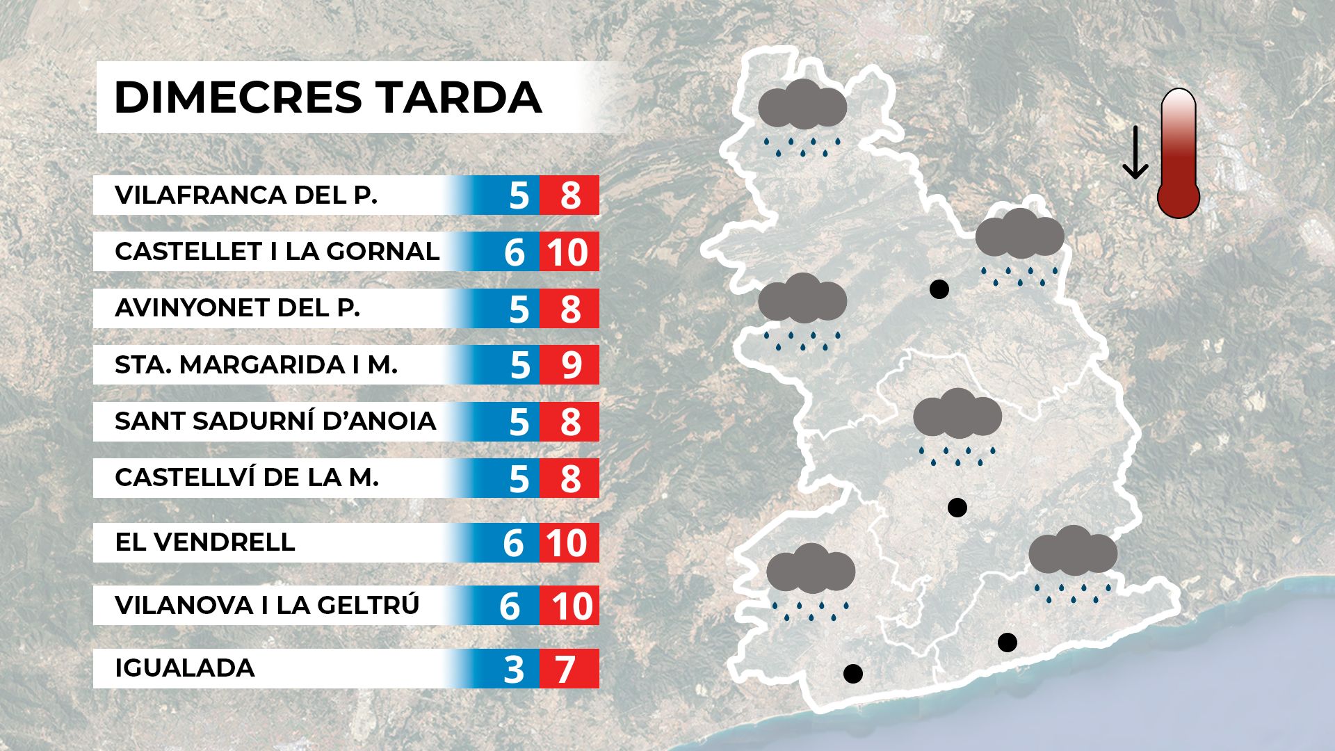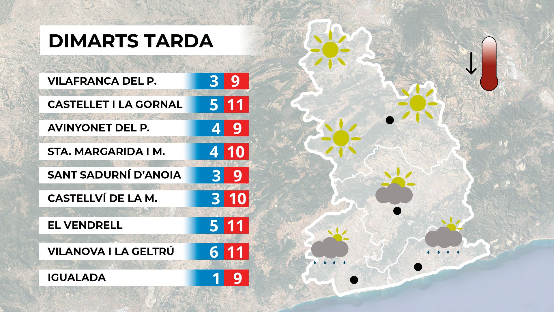 Durant el matí, el sol ha estat predominant, tot i que a les comarques més properes a la costa, com el Garraf i el Baix Penedès, hi han aparegut alguns núvols. A la tarda, s’espera un increment de la inestabilitat, amb possibles ruixats al Garraf, mentre que a la resta del territori el sol serà protagonista.