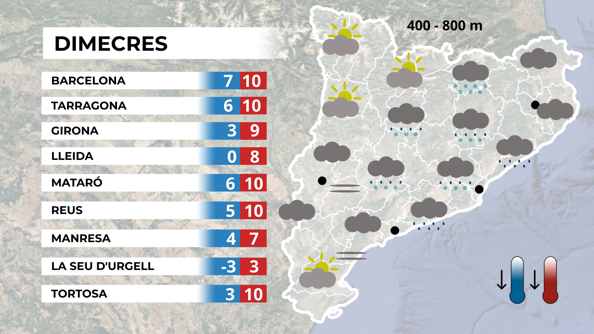 L’arribada d’aire humit, combinada amb les precipitacions, provocarà nevades febles a cotes de fins a 400 metres.