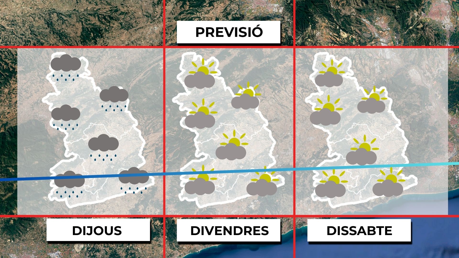 De cara a dijous, es preveuen alguns ruixats dispersos en diversos punts del territori. Tot i que la temperatura a les capes altes de l’atmosfera augmentarà, l’aire fred acumulat a terra i la desaparició dels núvols afavoriran glaçades generalitzades, especialment al prelitoral i l’interior.