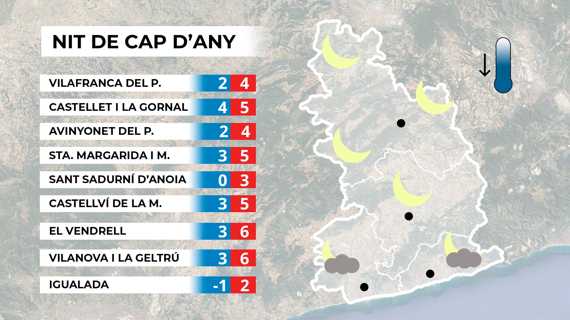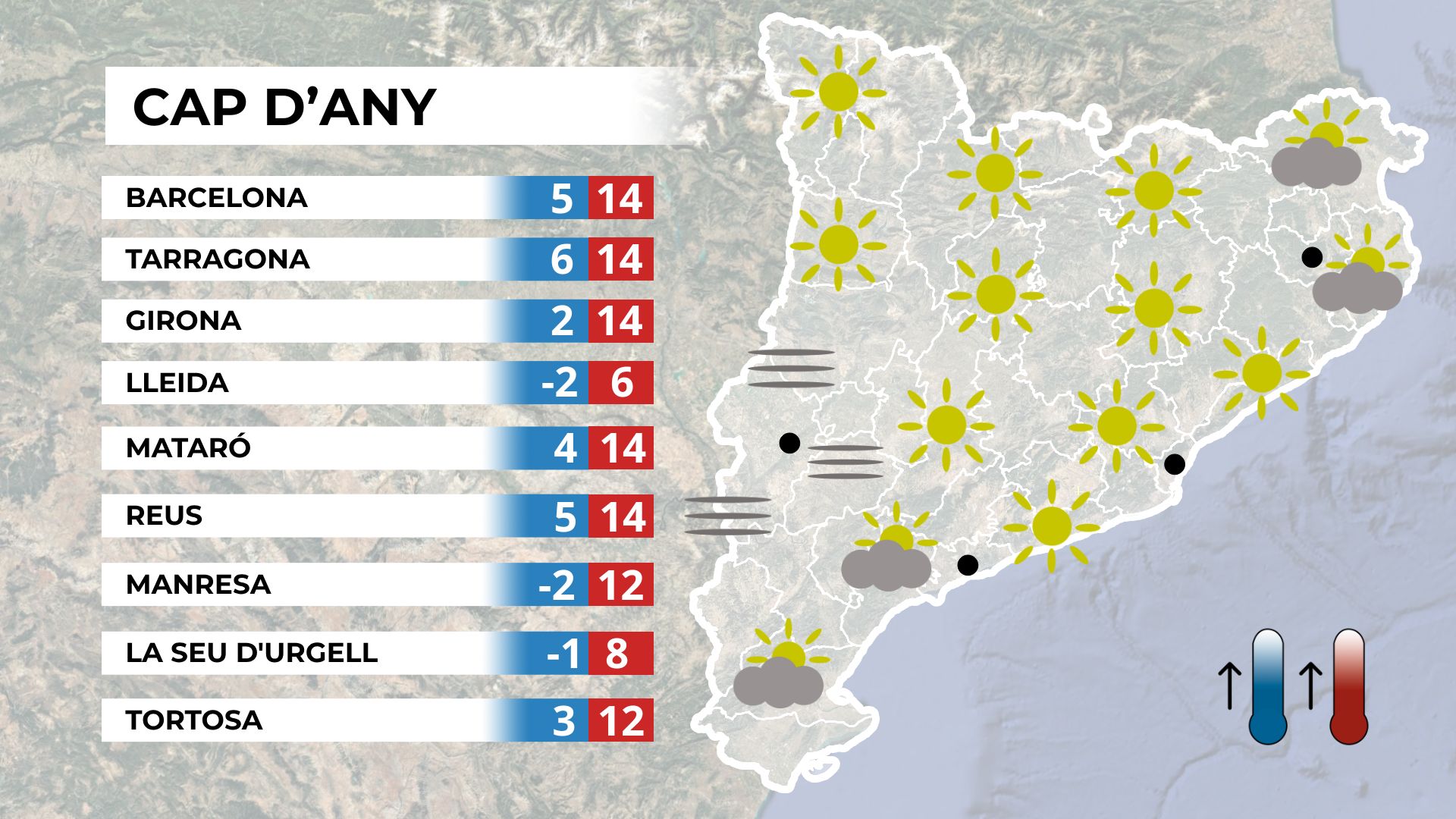 Els qui optin per celebrar el comiat de l’any a l’exterior hauran d’abrigar-se de valent. La Nit de Cap d’Any serà freda o molt freda a tot el territori, amb mínimes molt baixes i la possibilitat de gelades més enllà del prelitoral. El cel es mantindrà majoritàriament serè, cosa que accentuarà la sensació de fred. A les zones costaneres, però, podria aparèixer alguna nuvolada esporàdica.