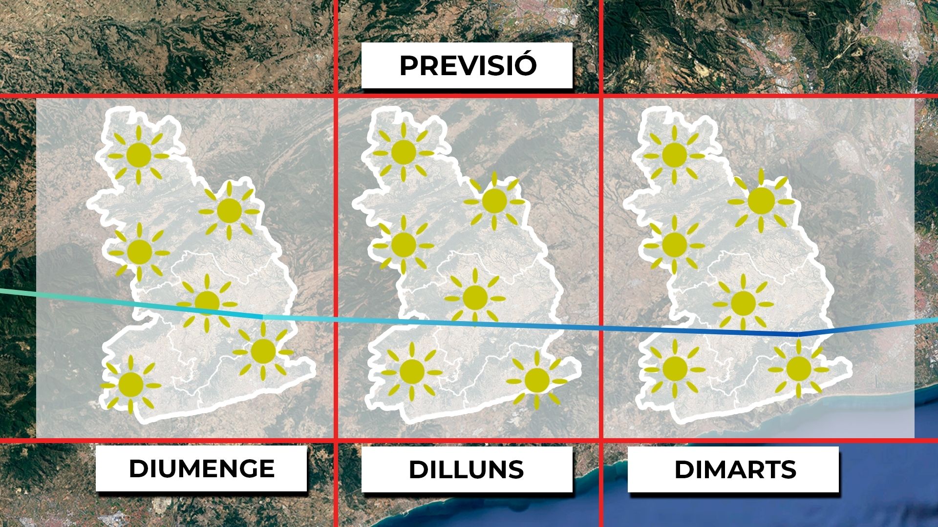Diumenge, la situació serà molt més tranquil·la, amb una clara millora pel que fa al vent i les pluges. El matí començarà amb sol a moltes comarques, tot i que podran aparèixer algunes boirines a l’interior. La tarda serà plàcida i suau a tot el territori.Fred i sol a partir de dilluns