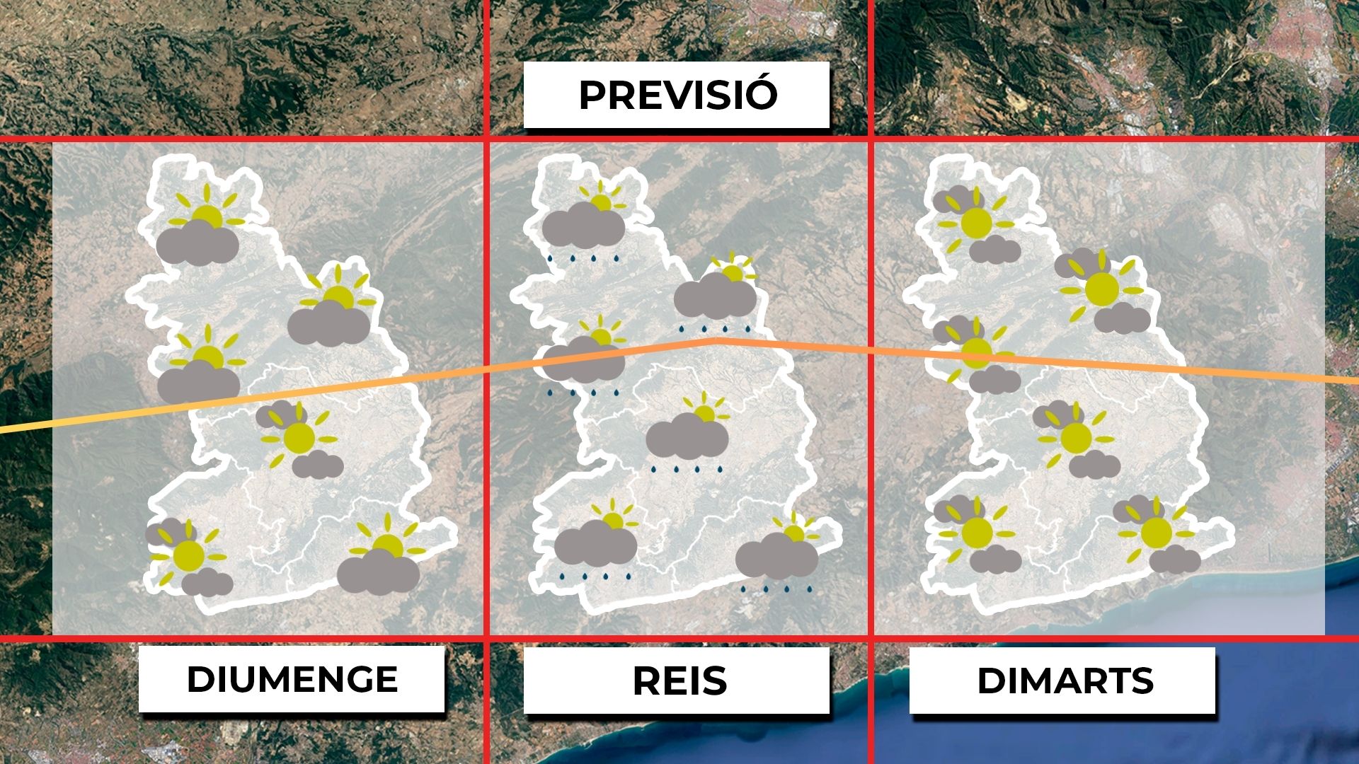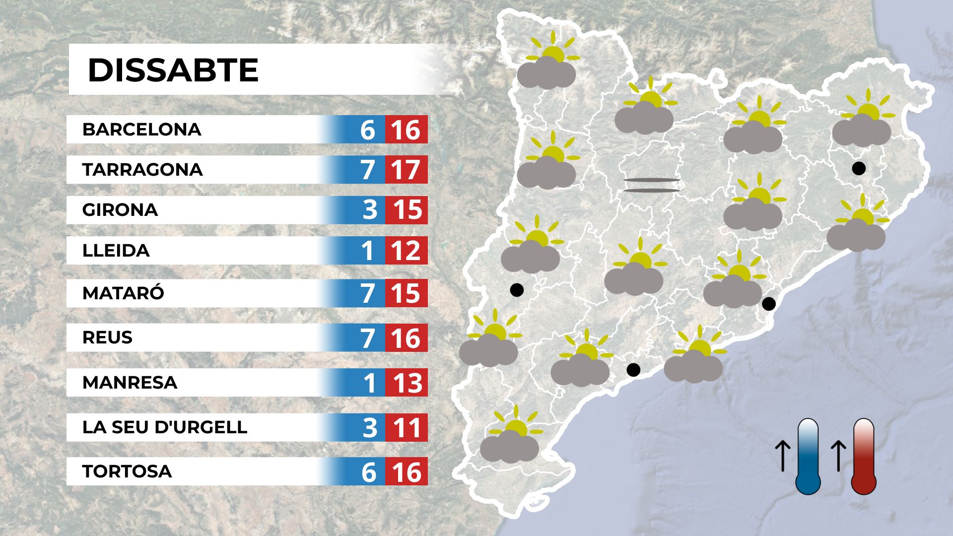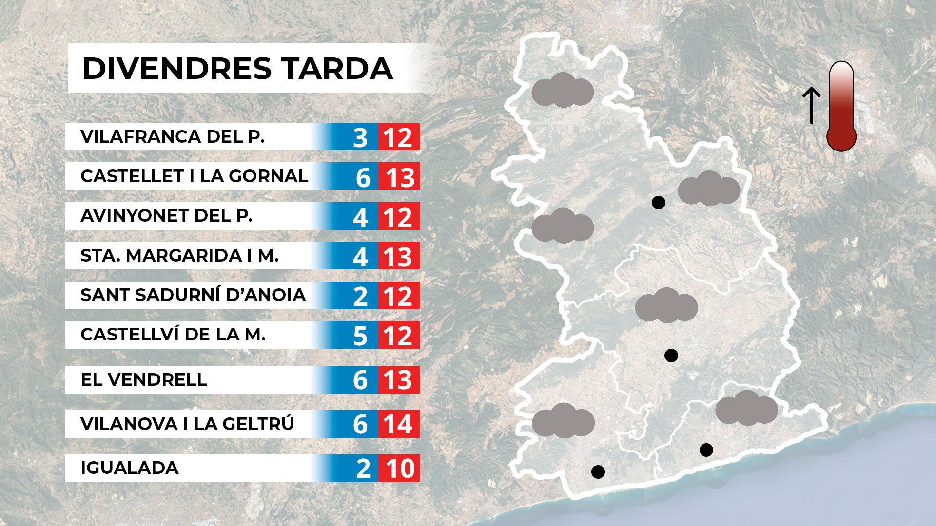 Demà, dissabte, ens llevarem novament amb un cel molt tapat. La presència dels núvols farà que les temperatures siguin més altes, però l’ambient seguirà sent fred a primera hora. A mesura que passi el migdia i, sobretot, a la tarda, els núvols començaran a trencar-se i el sol es farà més present. Això anirà acompanyat d’una pujada progressiva de les temperatures, que superaran els 15 graus a molts punts del Penedès. Mapa de previsió per a dissabte. A la resta del país, la situació serà similar, amb una millora a les comarques del Pla de Lleida, on la boira baixa es dissiparà i es podran veure algunes ullades de sol després de molts dies. Mapa de previsió general per a dissabte.