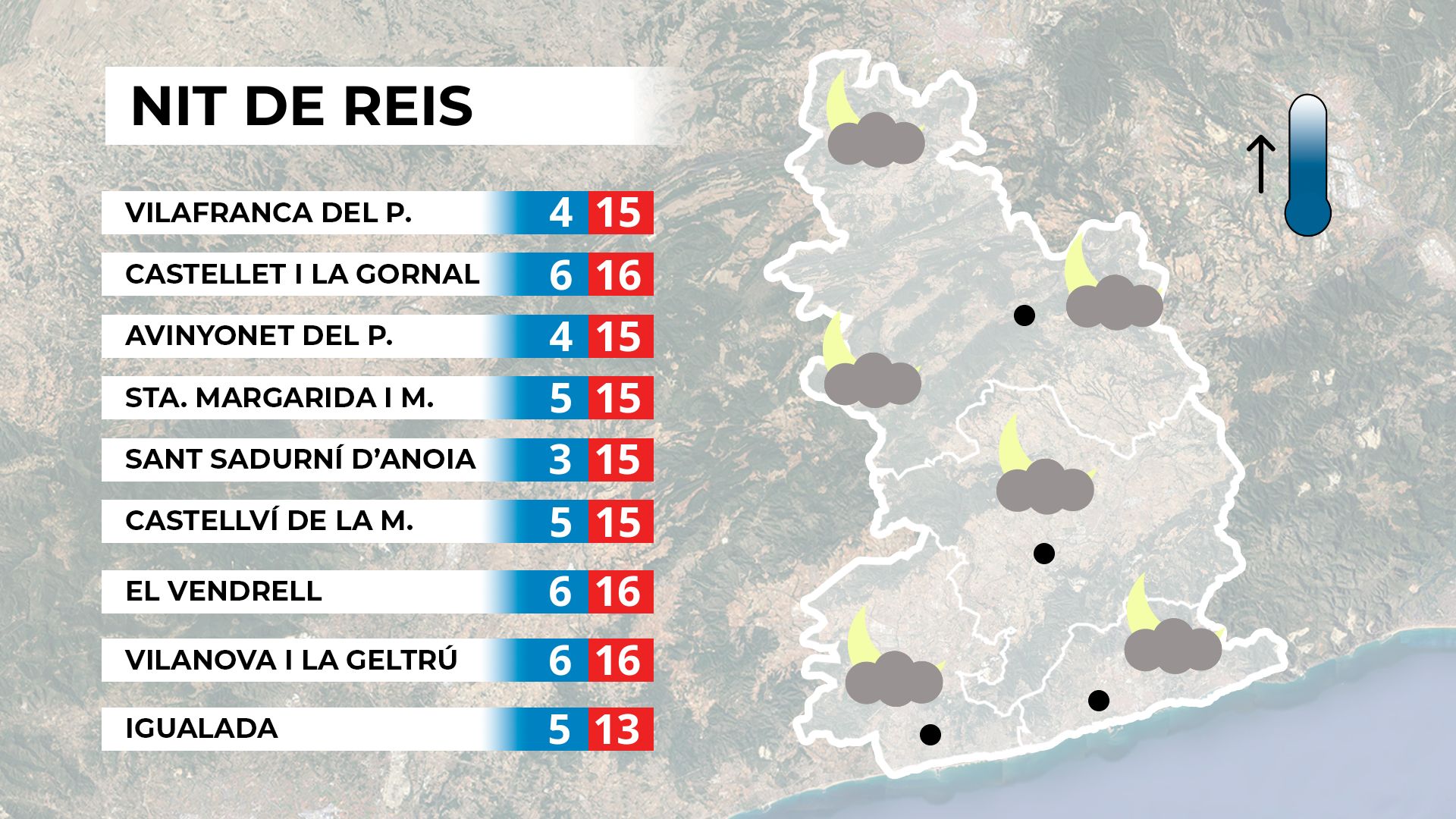 A mesura que avançada la nit de Reis i la matinada del Dia de Reis, la situació meteorològica començarà a canviar. Els núvols guanyaran terreny i es faran més densos. El matí de Reis encara començarà amb cel tapat en molts punts de Catalunya, però ràpidament les precipitacions faran acte de presència. Tot i que no s’espera una pluja abundant, hi ha possibilitat de pluges a tot el país amb un ambient poc fred a causa de l’augment considerable dels termòmetres. Mapa de previsió a mitjà termini.