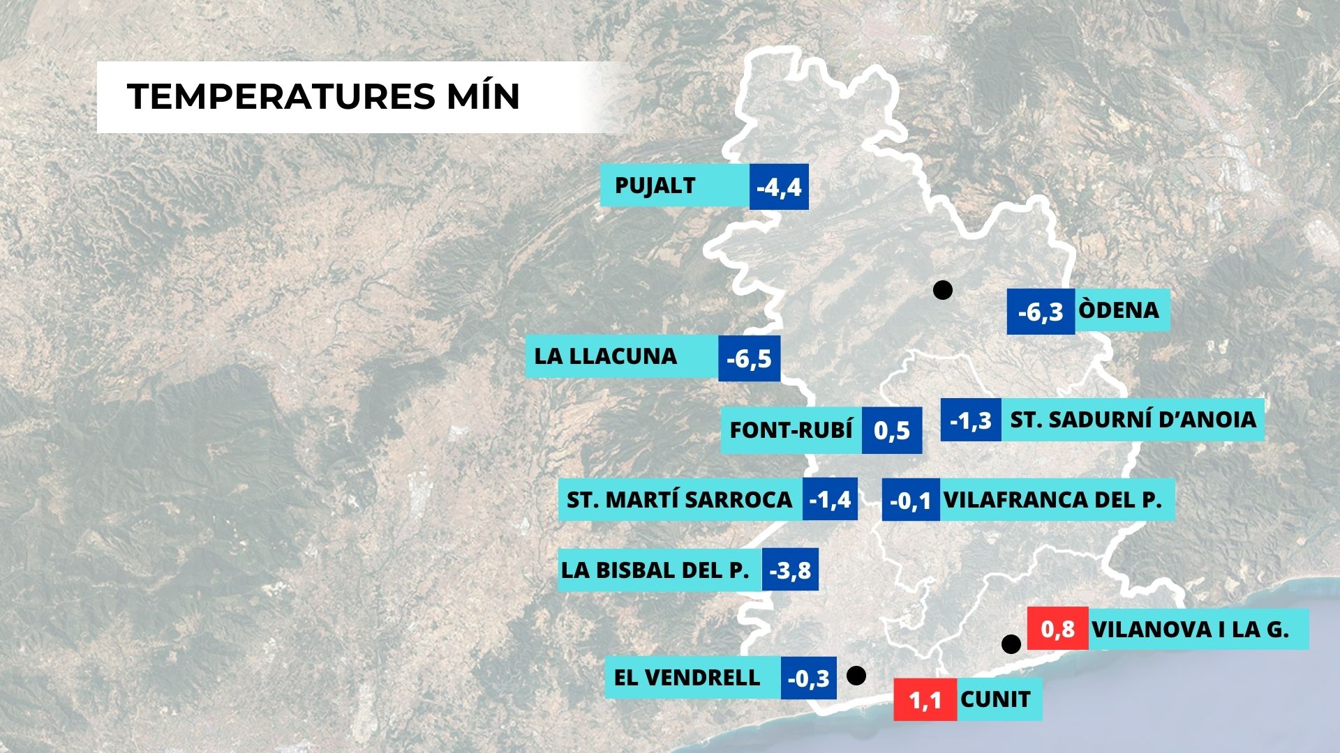 Entre les dades més destacades, sobresurten els -3,8 °C enregistrats a l’estació de la Bisbal del Penedès, els -6,3 °C d’Òdena i els -6,5 °C a la Llacuna.