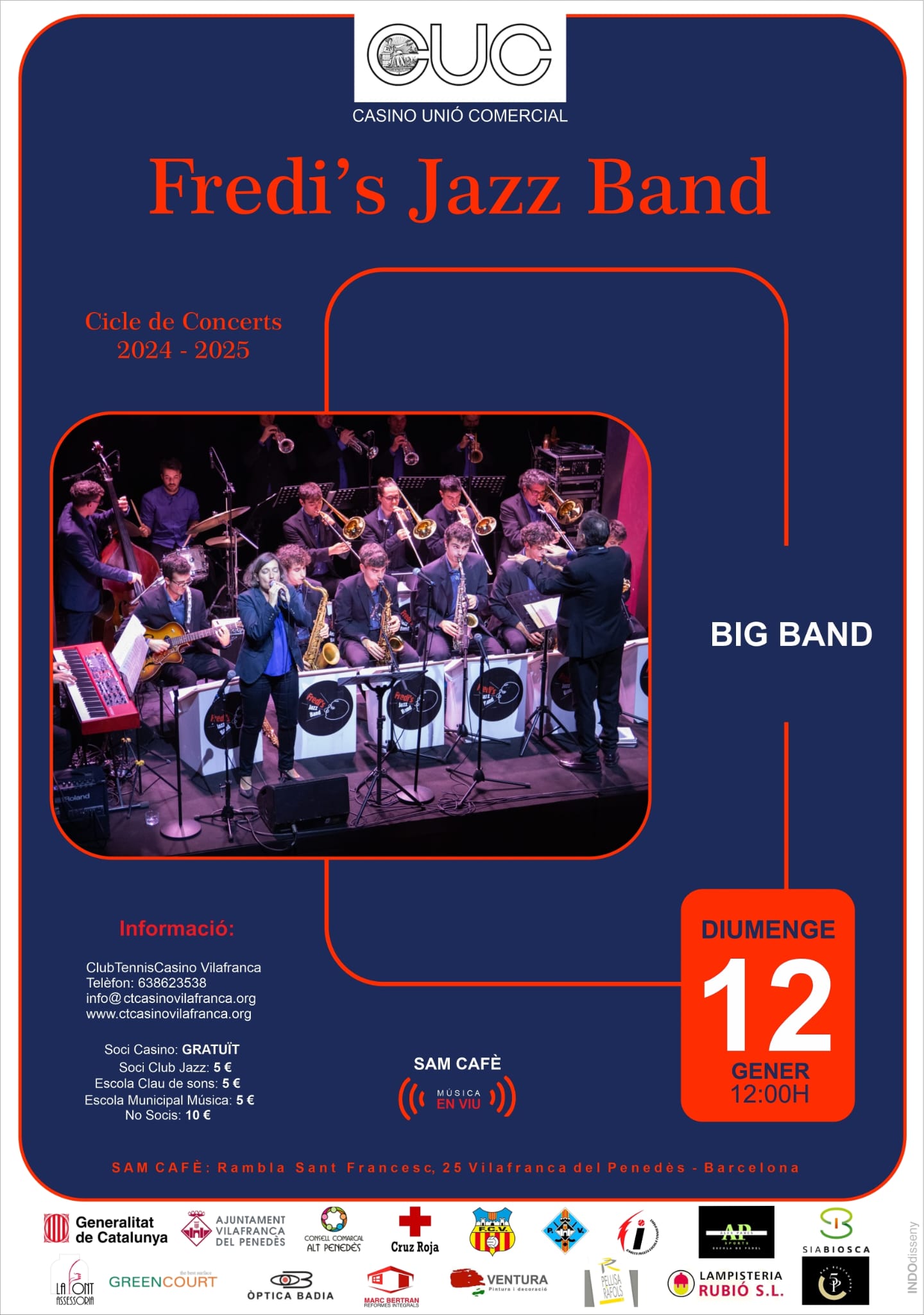 Per arrencar l’any aquest diumenge, 12 de gener, el Casino de Vilafranca presentarà l’actuació en directe de Fredi’s Jazz Band. Actuarà la Big Band de la mà del director Enric Alegre, reconegut saxofonista vilafranquí, acompanyat de 23 músics més.