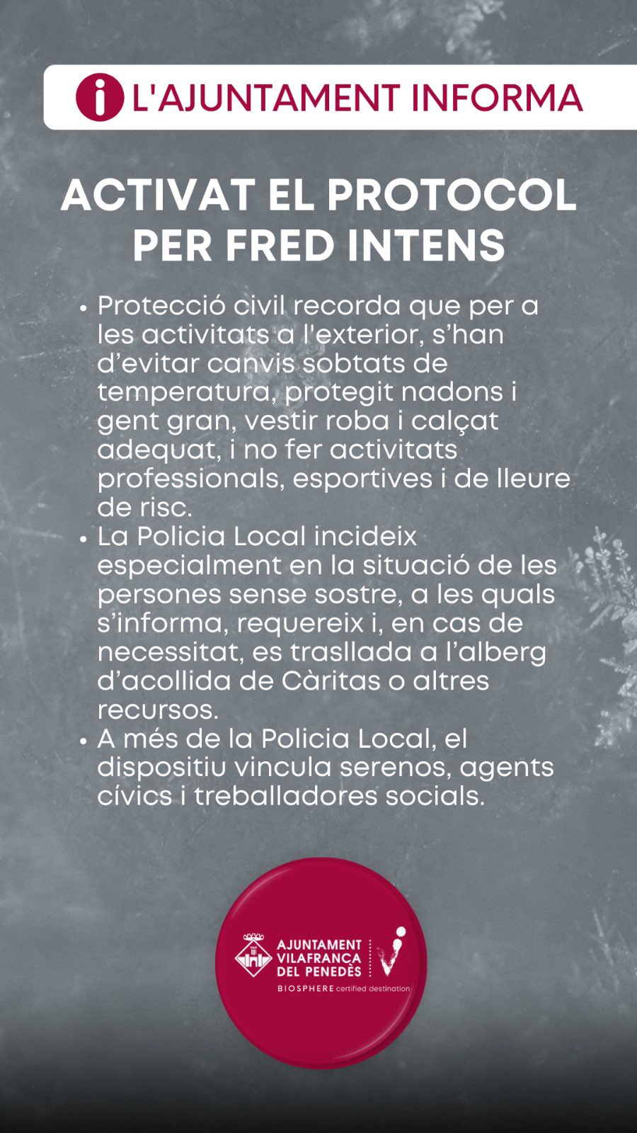 L’Ajuntament de Vilafranca activa el protocol per fred intens
