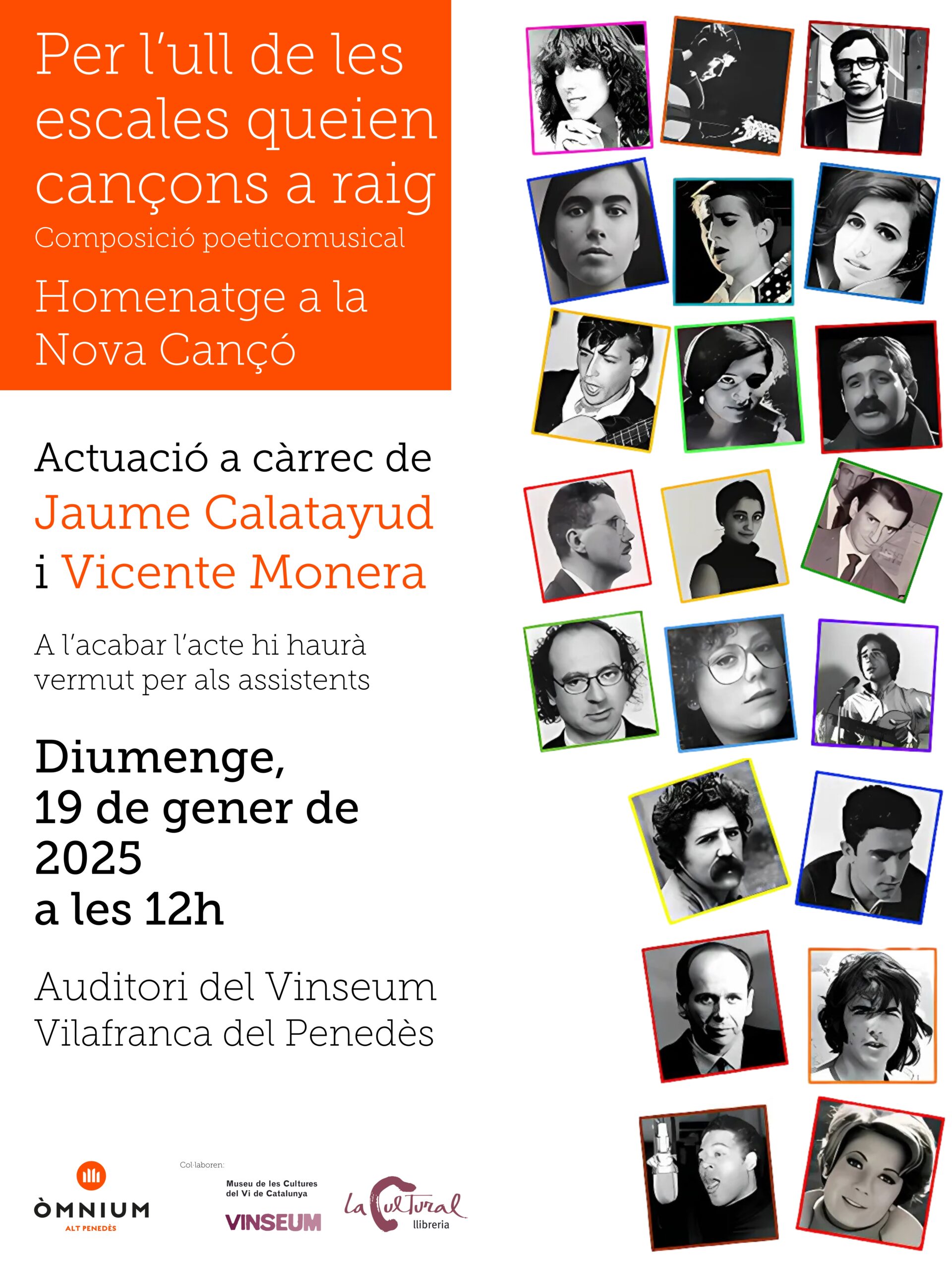 Òmnium Alt Penedès organitzarà l’homenatge aquest diumenge a les 12 del migdia a l’Auditori del Vinseum amb el duet format per Jaume Calatayud i Vicente Monera, que presentarà el seu espectacle poeticomusical ‘Per l’ull de les escales queien cançons a raig’.