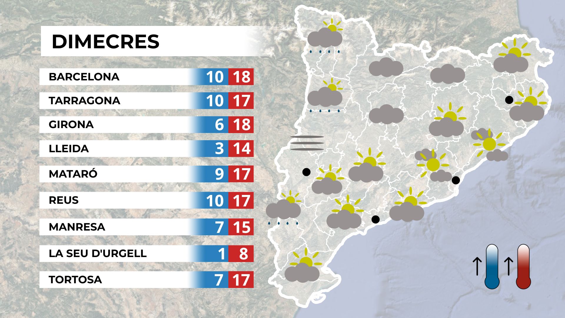 Demà, dimecres, s’espera una mica més de moviment meteorològic, especialment a partir de la tarda. Al matí, el sol dominarà a gran part del territori, i les temperatures tornaran a pujar, deixant un ambient poc fred.