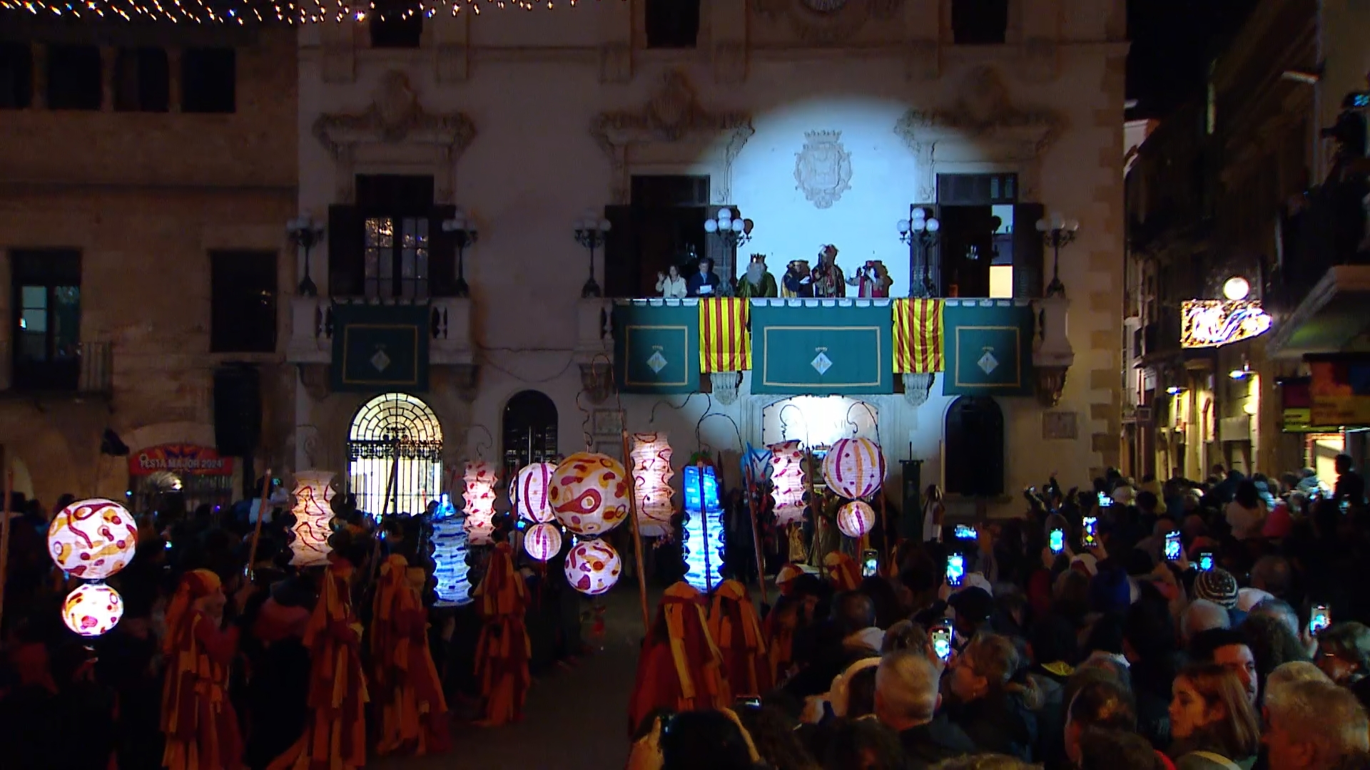 I a dos quarts de vuit la comitiva enfilava pel carrer de Sant Joan per fer entrada a la plaça de la Vila. Al capdavant el Gemínid i els personatges de l’Arcàdia acompanyats per la Fada Lua. Tot seguit l’estrella d’Orient amb una nova base que la feia brillar més. Després la carrossa del Patge Raimon que enguany estrenava la companyia de 8 carters reials. I les carrosses dels reis Melcior, Gaspar i Baltasar, que van baixar per ser rebuts per l’alcalde i la regidora de Cultura i pujar a dalt del balcó de l’ajuntament per dirigir-se a tota la població. Abans, però l’alcalde els va lliurar la clau de la ciutat per entrar a totes les llars.