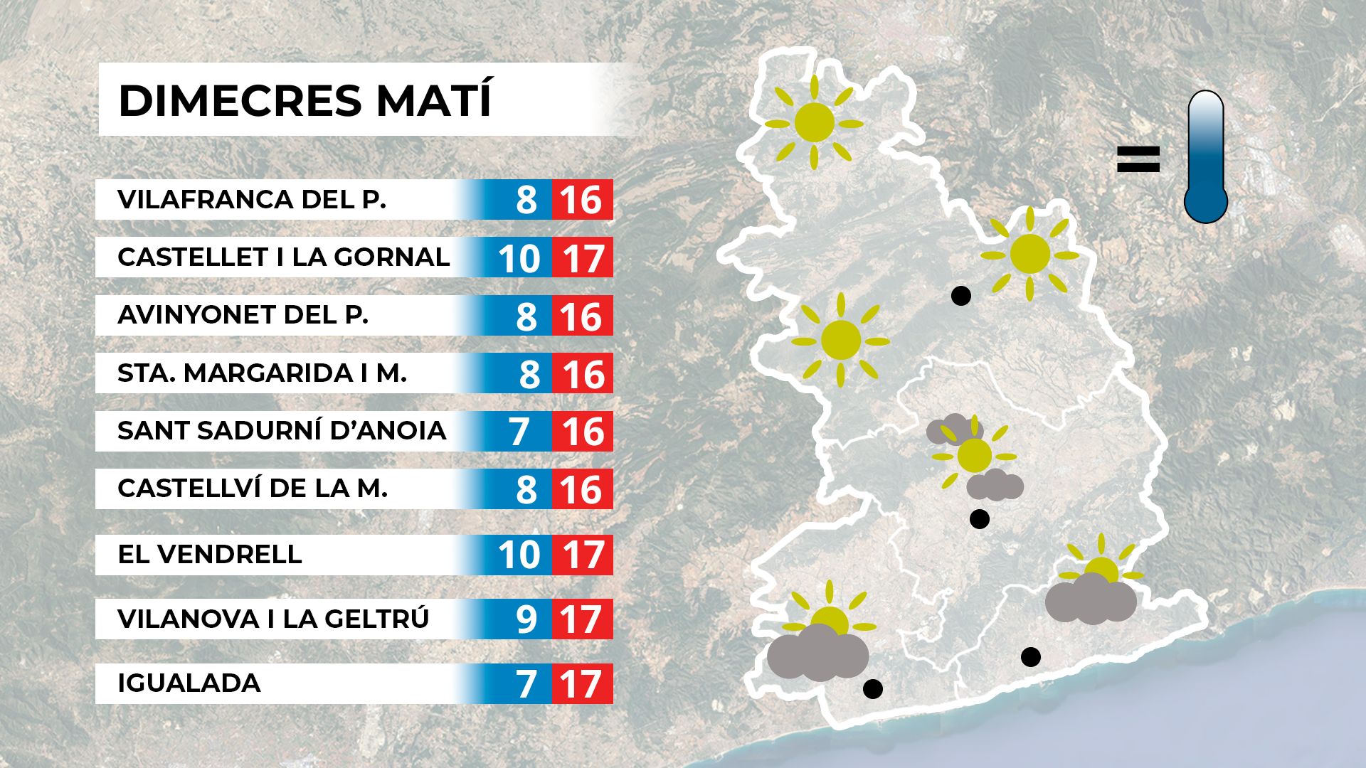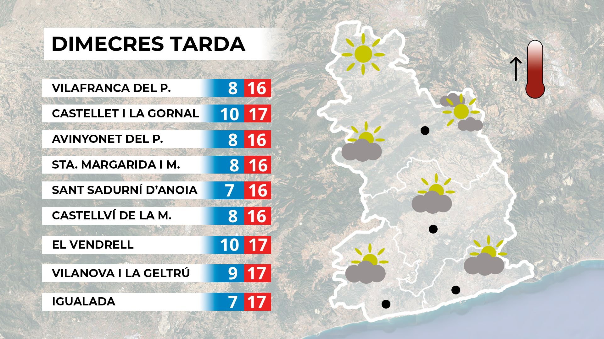 Dimarts al matí, les temperatures pujaran encara més, amb valors propis d’inicis de primavera. Això anirà acompanyat de molta nuvolositat, que es pot manifestar en forma de boires o boirines. La presència d’humitat reduirà la visibilitat a molts punts del Penedès a primera hora. A la tarda, el cel s’anirà aclarint i guanyarem estones de sol. Malgrat tot, l’ambient al migdia serà més fresc.