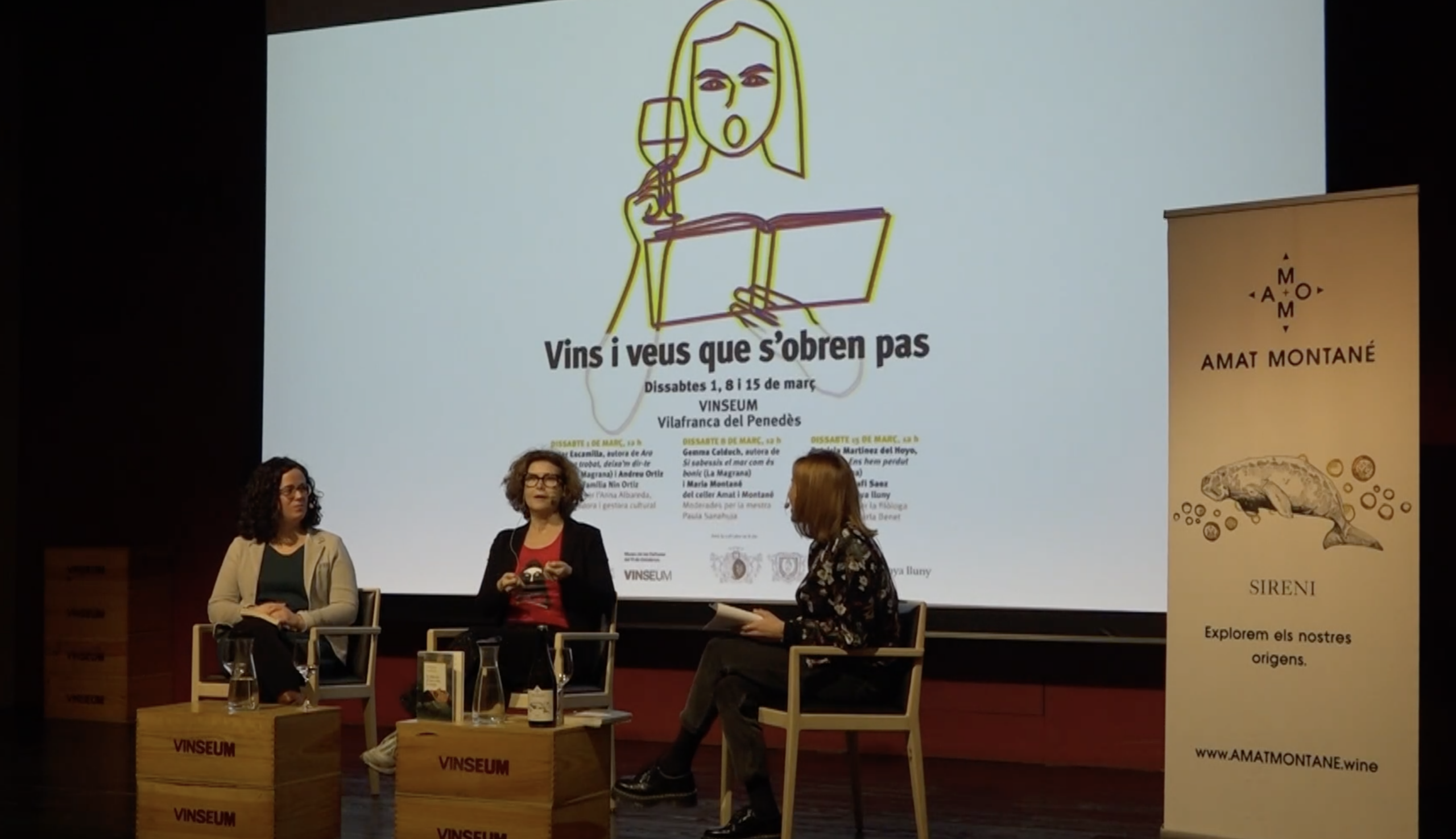 L’escriptora Gemma Calduch i la cellerista Maria Montané protagonitzaven dissabte la segona sessió del cicle Vins i veus que s’obren pas a l’auditori del Vinseum. Ho feien acompanyades per Paula Sanahuja, que s’encarregava de moderar l’acte.