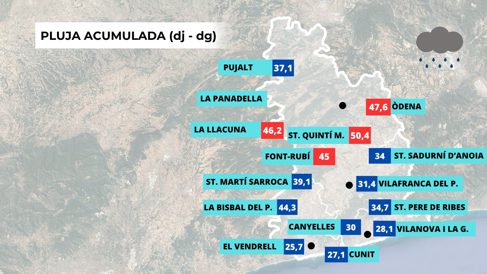 Les darreres jornades han estat marcades per la pluja. La borrasca Jana ha regat Catalunya de manera abundant i generalitzada, aportant una aigua molt benvinguda per als embassaments, que ja han pujat fins al 41% de la seva capacitat. Al Penedès, les precipitacions han afectat tota la Vegueria, especialment la meitat nord, on s’han registrat més de 50 litres per metre quadrat a Sant Quintí de Mediona i més de 45 a Font-rubí, la Llacuna i Òdena. Balanç de precipitació de l’episodi de pluja. Font: Dades de la Xarxa d’Estacions Automàtiques del Sevei Meteorològic de Catalunya. Aquestes pluges també s’han fet notar en els rius i embassaments de la zona. La riera de Vilafranca, al seu pas per Santa Margarida i els Monjos, baixava plena, mentre que el pantà de Foix ha assolit el màxim de la seva capacitat.