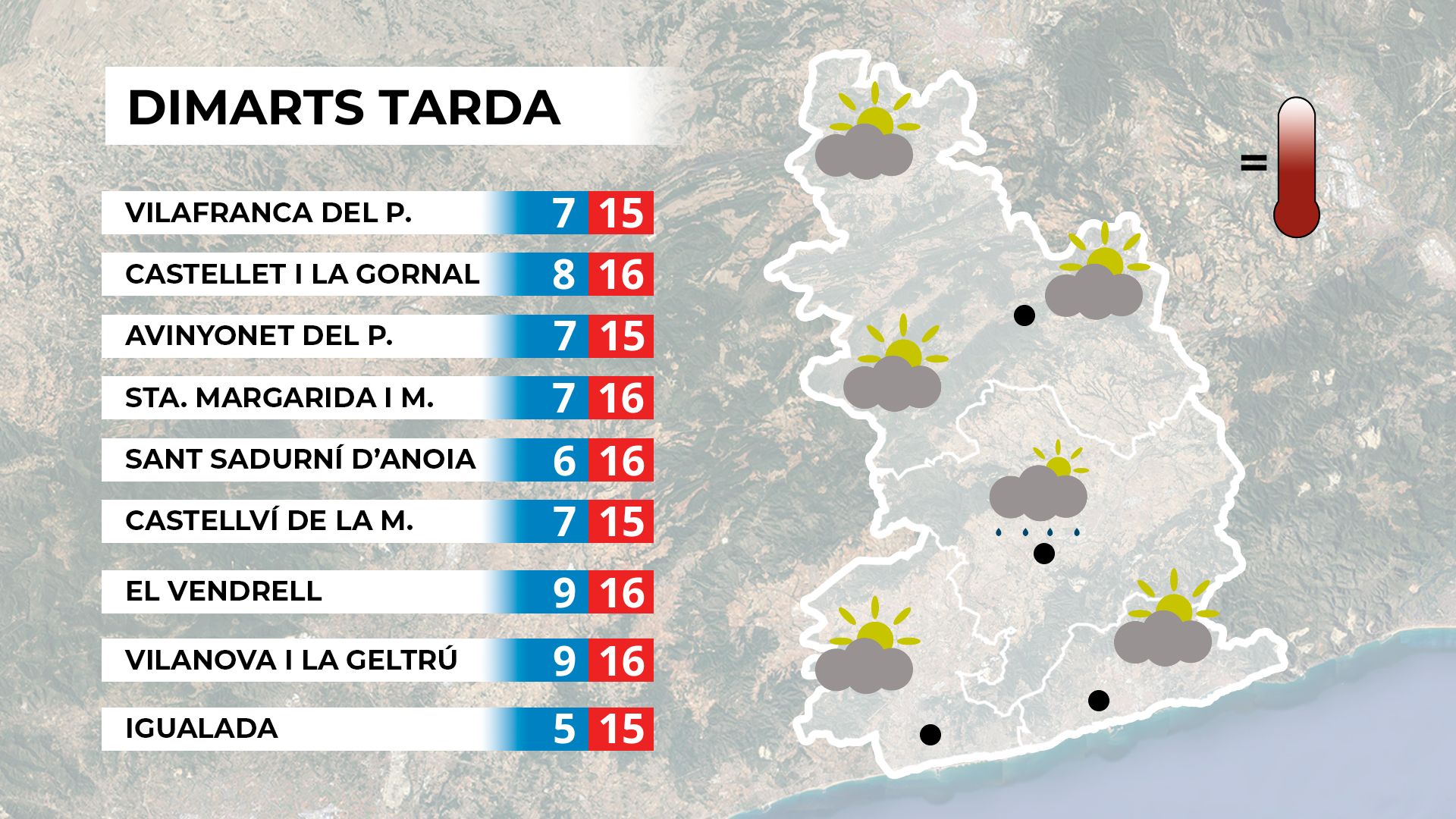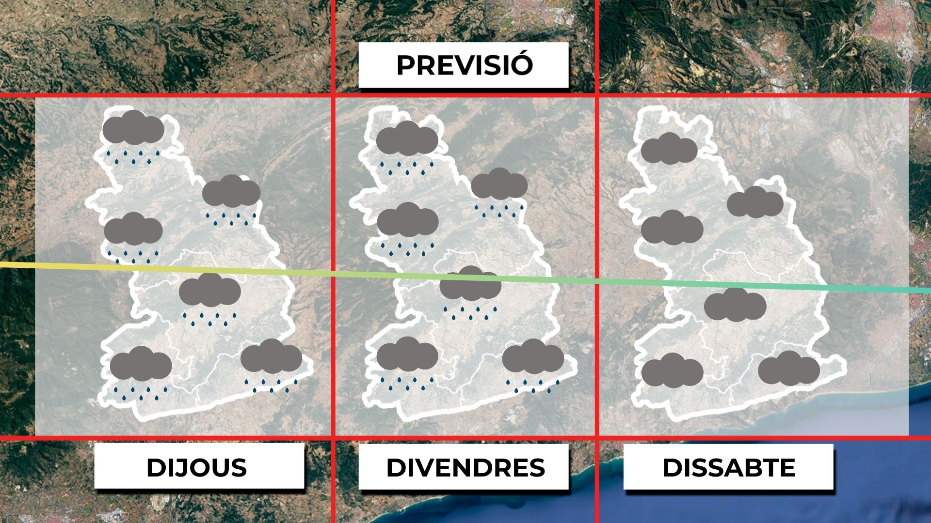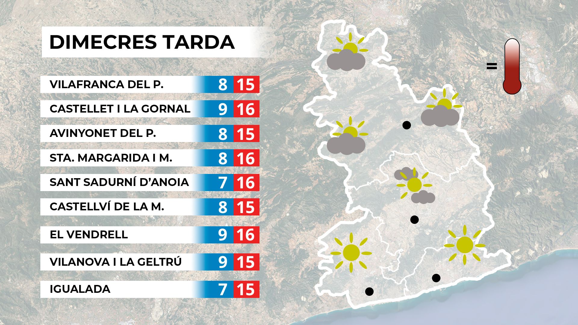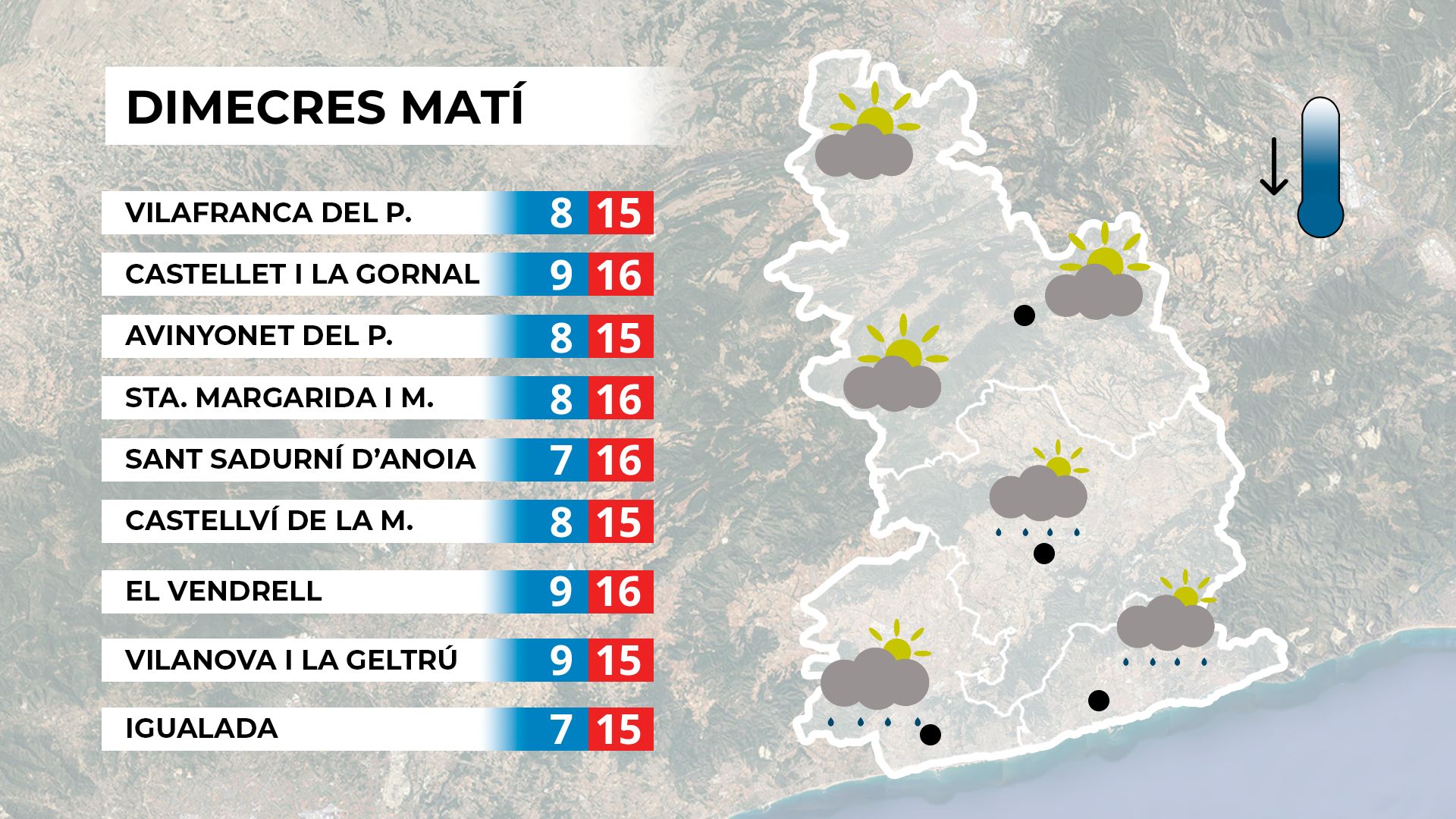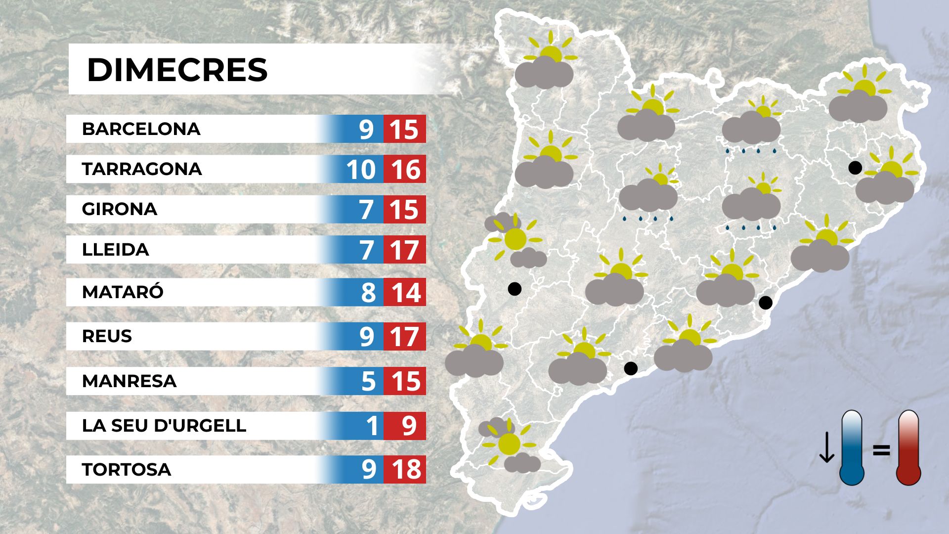 Dimecres al matí les precipitacions minvaran i s’obriran clarianes. L’ambient serà suau, amb mínimes superiors als 8 °C.  Mapa de previsió per a dimecres al matí. A la tarda, el sol s’imposarà, amb alguns intervals de núvols i màximes al voltant dels 16 °C. Mapa de previsió per a dimecres a la tarda. A la resta del país dominarà la variabilitat, amb creixement de nuvolades i tempestes al Pirineu. Mapa de previsió general per a dimecres.