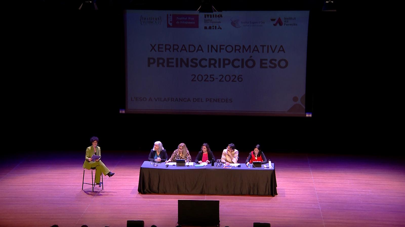 Un centenar de persones de forma presencial i 400 per youtube van seguir aquest dijous al vespre la segona edició de la jornada d’informació conjunta dels cinc instituts públics de Vilafranca. Fins fa dos anys a cada centre es feia una reunió amb la direcció per explicar la seva oferta de forma general. En ser cinc els instituts, es feia difícil que les famílies poguessin anar a tots els centres i per això van decidir fer-ho conjunt. La jornada comptava amb la participació dels directors i directores dels Instituts Eugeni d’Ors, Alt Penedès, Milà i Fontanals, l’institut nou de Vilafranca i Vilafranca 2.