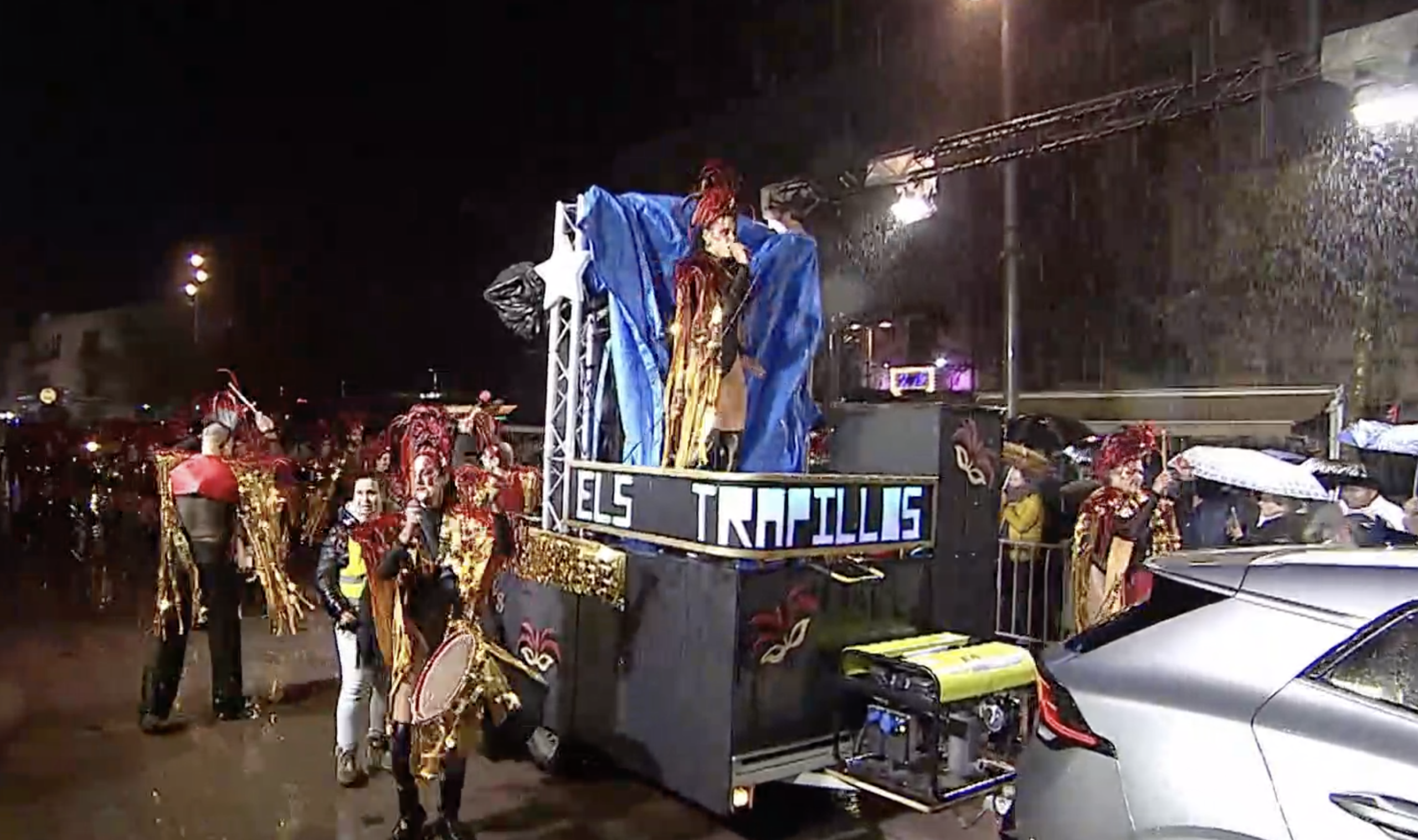 Però enguany va ser amb més intensitat que mai. Malgrat tot els organitzadors van optar per mantenir-la, perquè el calendari del carnaval al Penedès ja no oferia més possibilitats d‘encaix i els membres de les carrosses tenien ganes de celebrar la festa. La situació va deslluir la imatge d’una rambla de Sant Francesc que, tot i així, tenia públic sota els paraigúes. Dels 32 grups, entre carrosses i comparses inscrites, 11 van marxar abans d’iniciar la rua, i 21 van acabar desfilant. A les nou i vint minuts arribava a la part central de la rambla la Deessa egípcia de la Ràpita, una de les agrupacions més veteranes, que anava seguida de la carrosa del Carnaval de Clariana, amb 170 balladors i temàtica també sobre l’antic Egipte. No va faltar a la cita també la colla d’Univers Penedès, o una de les moltes carrosses dels Monjos, com la dels Trapillos, que malgrat la pluja mantenine el seu fet distintiu, que era l’actuació en directe d’una cantant. També hi havia participació de grups de Pacs, de Banyeres, Canyelles o Sant Pere Molanta.