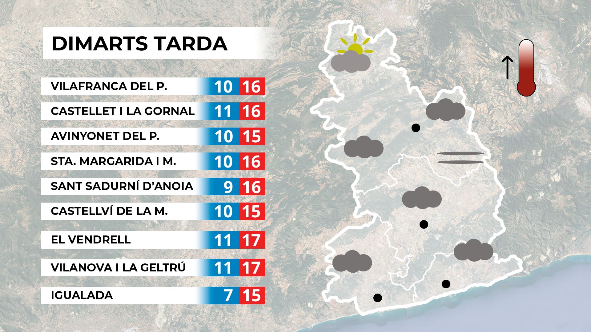 La setmana es presenta amb canvis destacables amb l’arribada d’una llevantada a partir de dijous i una altra a partir de dissabte. Tot i això, ahir dilluns va ser una jornada molt ennuvolada, amb precipitacions als dos extrems del país, mentre que al Penedès ens en vam quedar al marge. Aquest dimarts serà un dia de treva, amb núvols al matí i més clarianes a la tarda. Les temperatures es mantindran suaus, amb poc o gens de fred.