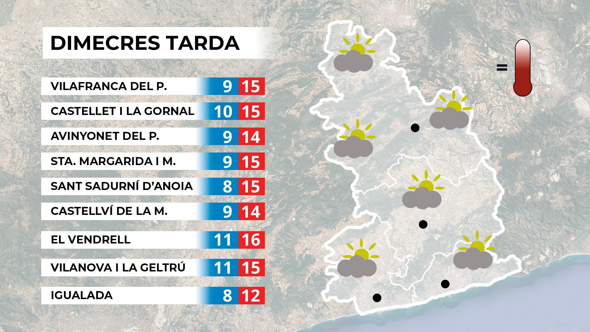 Al Penedès, el sol serà el protagonista durant bona part del dia. A primera hora, les temperatures seran més fredes, amb mínimes al voltant dels 4 a 6 graus.
