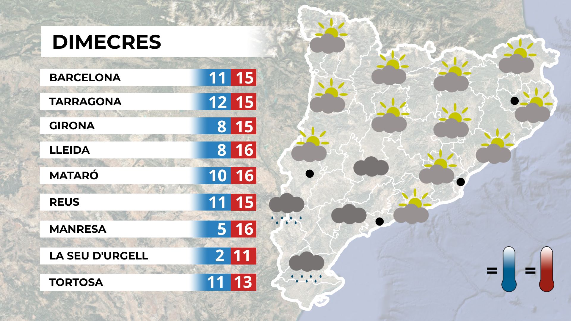Dijous la situació canviarà radicalment. El dia s’aixecarà amb un cel ben carregat de núvols i amb les primeres precipitacions a la meitat sud i centre del país. Les boires seran abundants, amb una reducció considerable de la visibilitat a les planes. A la tarda, les precipitacions s’estendran arreu i el vent de component nord i est es deixarà notar en punts del litoral i prelitoral.