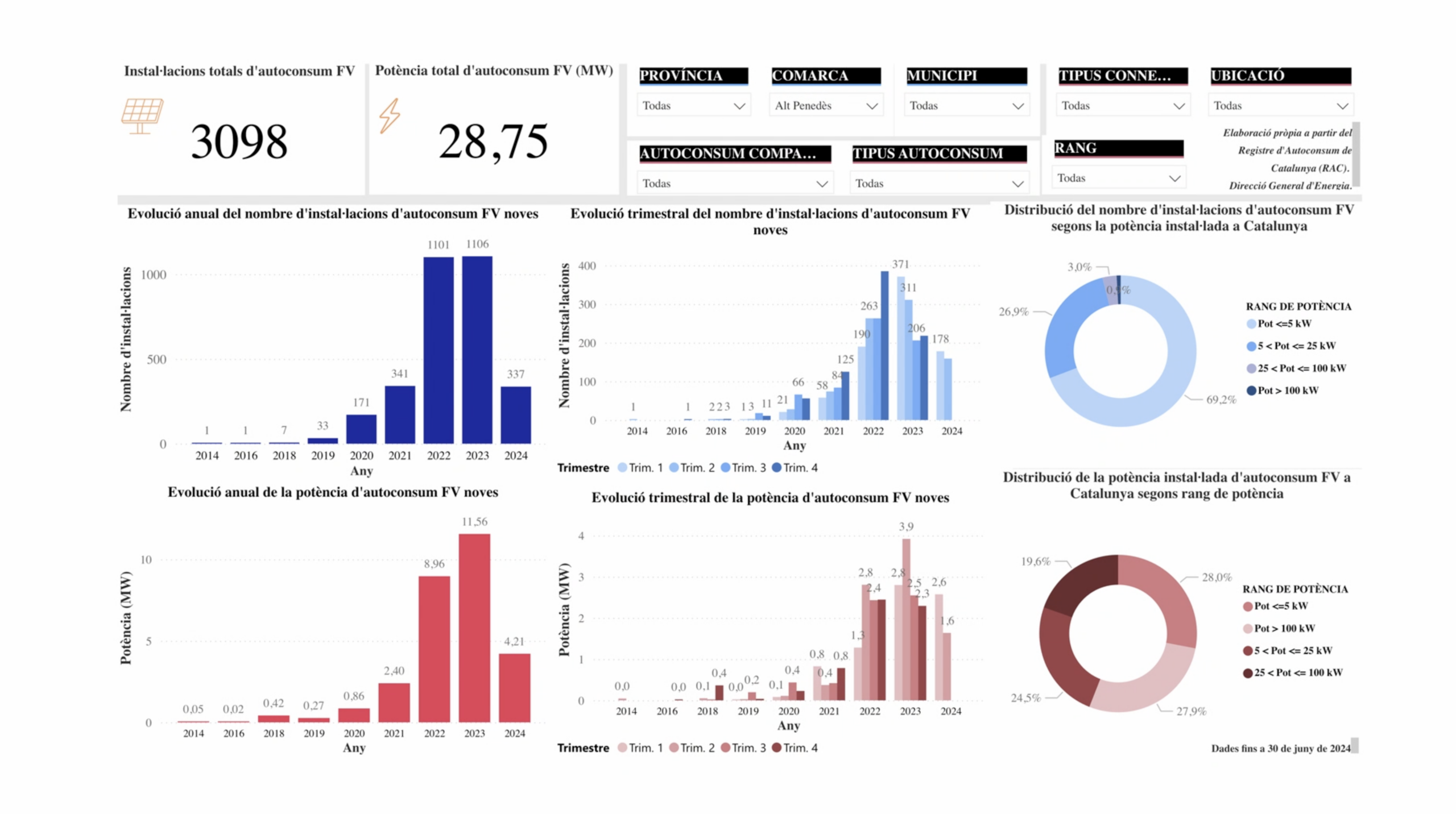 En total, l’Alt Penedès genera 41 megawatts procedents d’energies renovables. Segons l’Observatori de l’Autoconsum de Catalunya, a la comarca hi ha 3.098 instal·lacions fotovoltaiques d’autoconsum, amb 28’75 megawatts de potència.