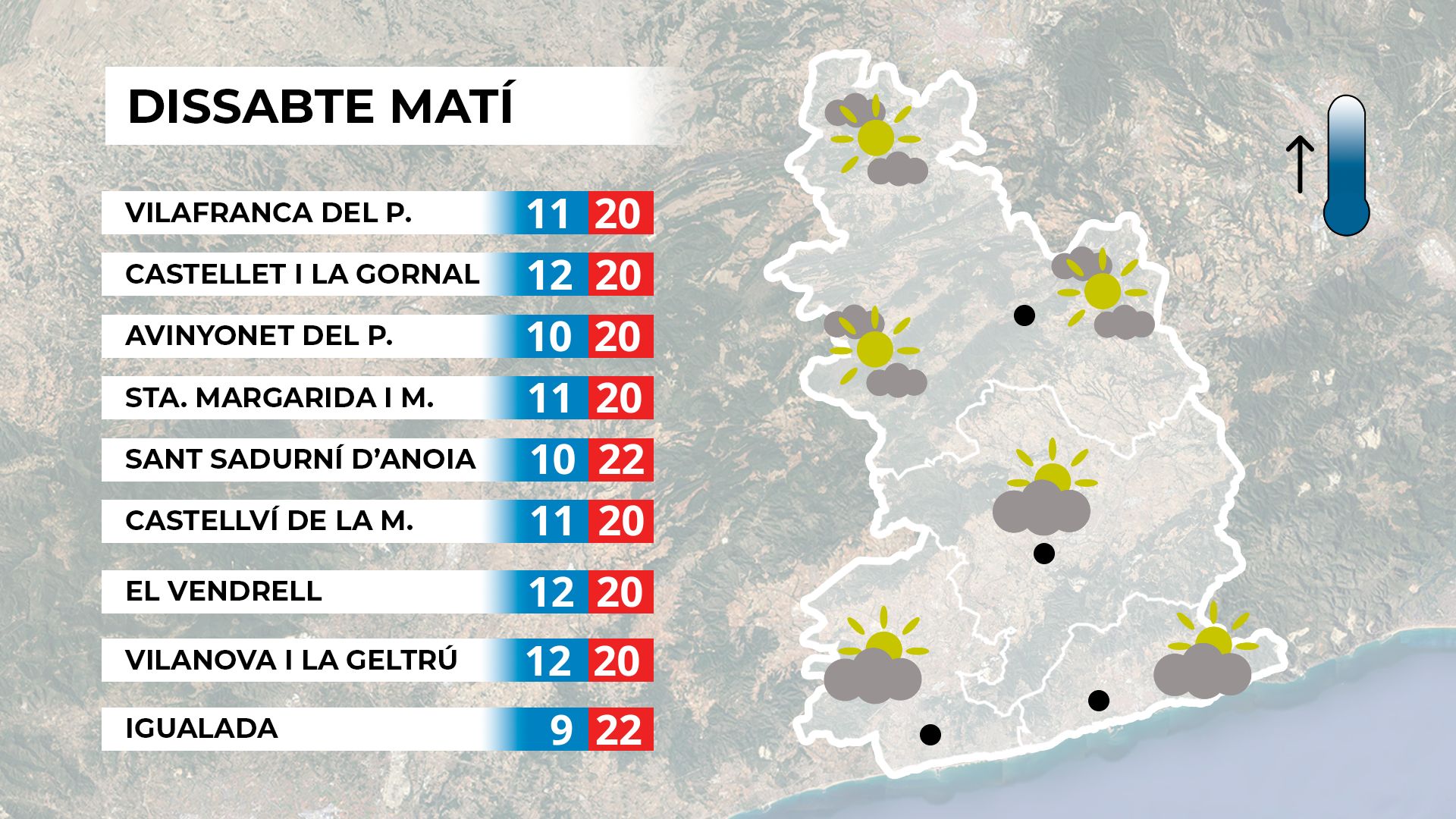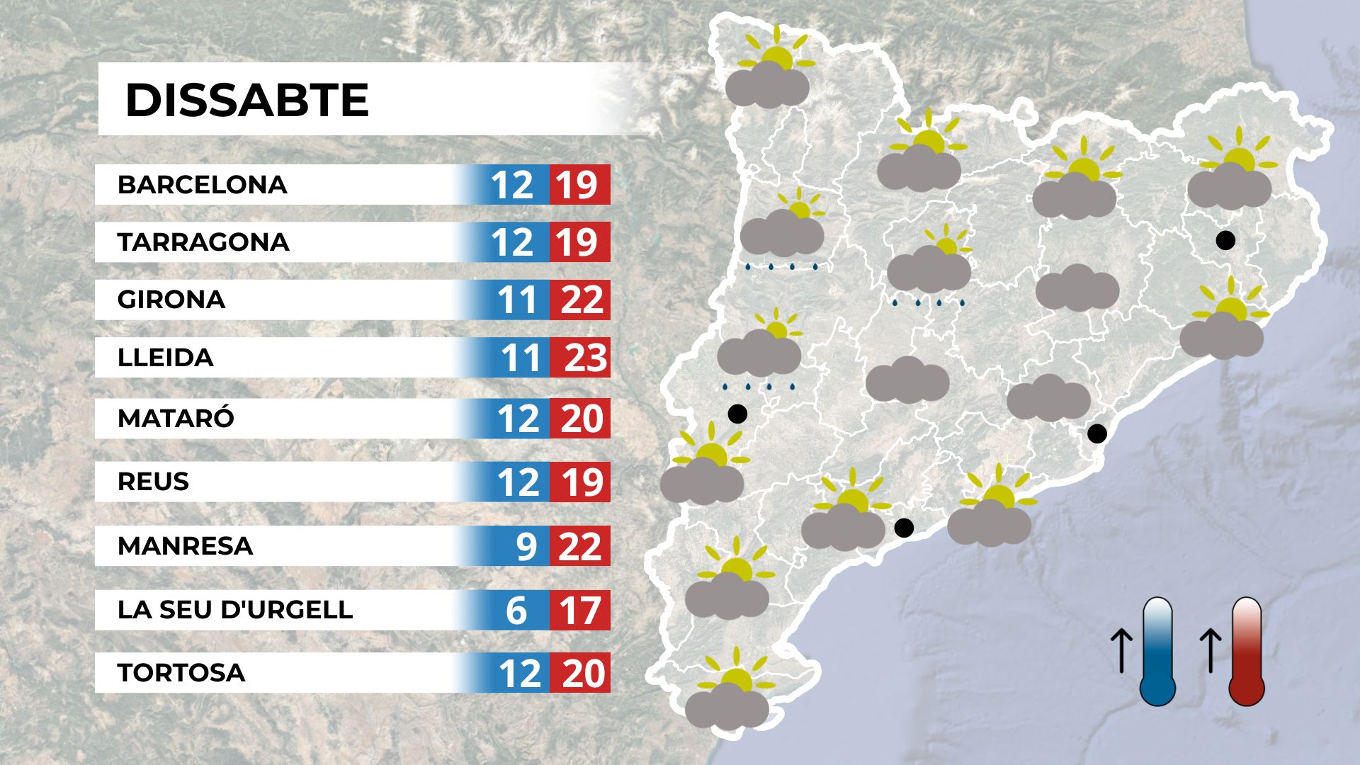 Dissabte començarà amb força sol, tot i que les nuvolades seran poc destacades. Al matí, les temperatures seran fresques, però a migdia es recuperaran ràpidament, superant els 22 graus en diversos punts del país. Mapa de previsió per a dissabte al matí. A la tarda, l’aparició de núvols serà més evident. Mapa de previsió per a dissabte a la tarda. La resta de Catalunya viurà un dissabte amb sol durant el matí, però amb més núvols a la tarda, especialment a les comarques centrals, el Pirineu i el Baix Pirineu. Al nord de Lleida podria caure alguna gotellada poc important. Mapa de previsió general per a dissabte.