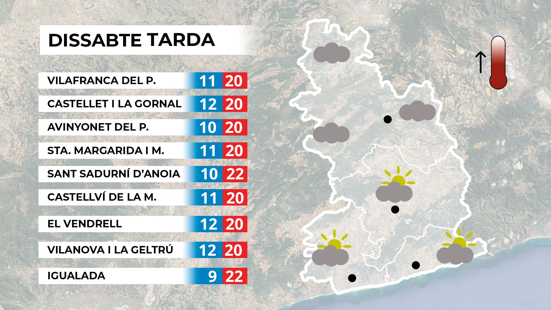 Ens aproximem al cap de setmana i també a l’inici de la Setmana Santa. Aquest divendres ha començat amb sol, alguns núvols alts i un ambient lleugerament més fresc. A mesura que avanci la tarda, les temperatures remuntaran fins a superar els 20 graus en moltes zones del Penedès, mentre que les nuvolades aniran apareixent, especialment al litoral, que seran del tot inofensives. Mapa de previsió per a divendres a la tarda.
