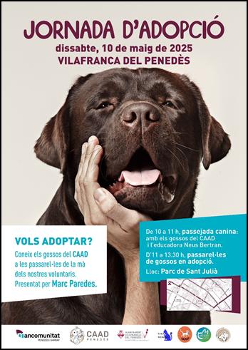 El Centre d’Acollida d’Animals Domèstics del Penedès (CAAD Penedès) celebrarà una jornada d’adopció de gossos aquest dissabte, a les 10h, al parc de Sant Julià.