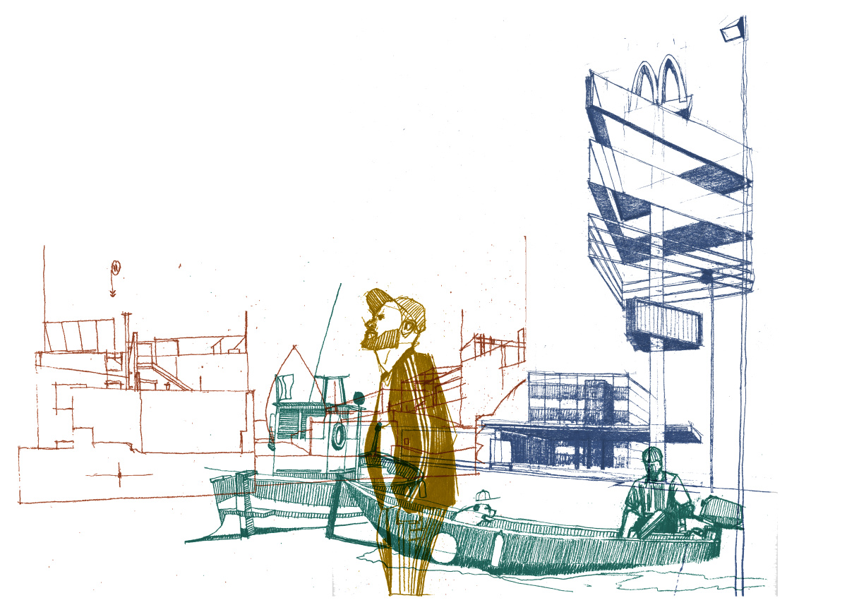 Laguna presenta una sèrie de dibuixos de paisatges imaginaris que sorgeixen a partir de combinar elements reals: paisatges, espais quotidians i personatges que l’acompanyen en el dia a dia, des de llocs marginals fins a elements icònics que tots tenim al nostre imaginari que revisita per a dibuixar a l’aire lliure en el bloc d’esbossos.