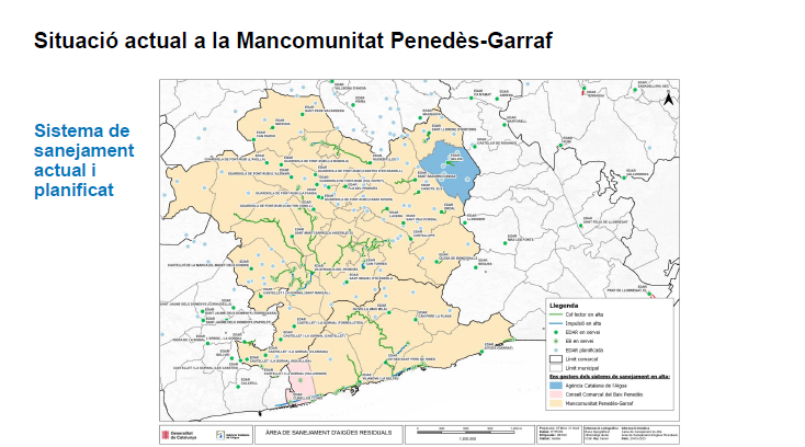La Mancomunitat Penedès – Garraf gestiona els sistemes de Sanejament en alta, com col·lectors, bombaments, fosses sèptiques i depuradores, que li han delegat els municipis que en formen part i que estan inclosos en el Pla de Sanejament de Catalunya de l’Agència Catalana del Aigua. En aquest sentit la Mancomunitat actua com a responsable de la gestió del sistema públic de sanejament en alta i del seu abocament.
