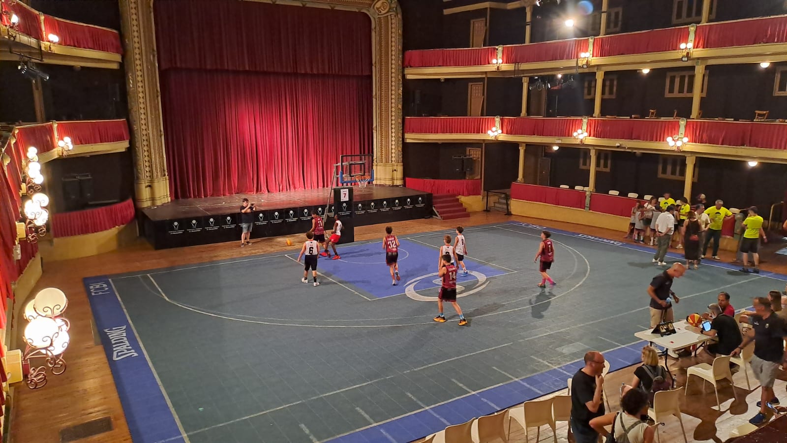 Una imatge insòlita, amb el centenari teatre com a escenari de partits de bàsquet.