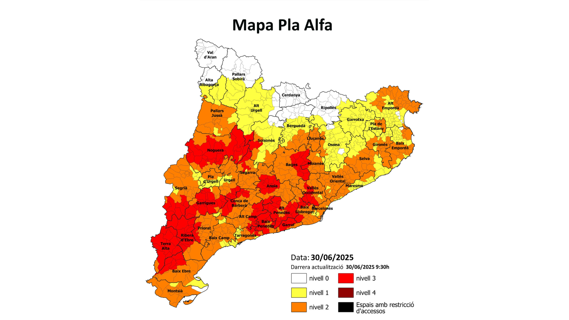Els Agents Rurals han actualitzat aquest dilluns el mapa del Pla Alfa i han elevat al nivell 3 per «perill molt alt» d’incendi forestal bona part de la comarca.