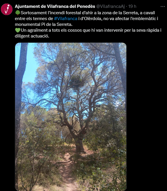 A la zona on es va produir l’incendi hi ha l’emblemàtic pi de La Serreta, que no es va veure afectat pel foc. Segons la descripció dels mapes de Patrimoni Cultural de la Diputació de Barcelona es tracta d’un espècimen de pi blanc de caràcter monumental, d’una alçada de 20 metres i capçada d’uns 23 metres. El seu tronc té una circumferència de més de 6 metres. Se li pressuposen més de 200 anys d’edat. “Sense cap mena de dubte, és el millor exemplar de Pinus halepensis de tot el Penedès”.