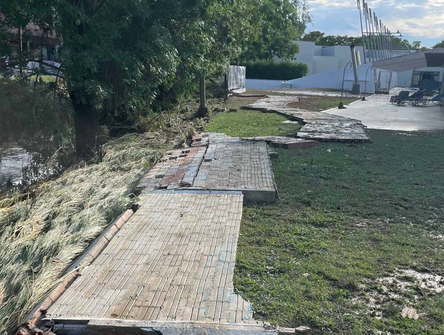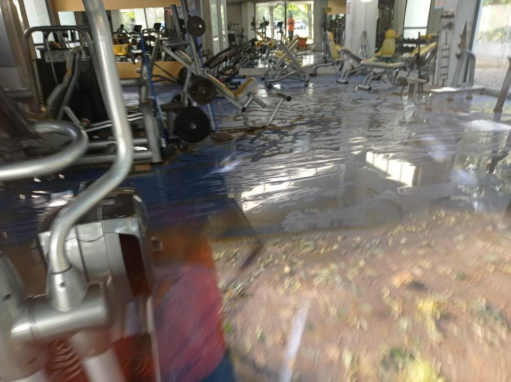 La força amb què ha baixat la riera ha fet que cedís el mur que encercla el Complex per la part de darrere l’entrada principal. L’aigua també ha inundat soterranis i plantes baixes.