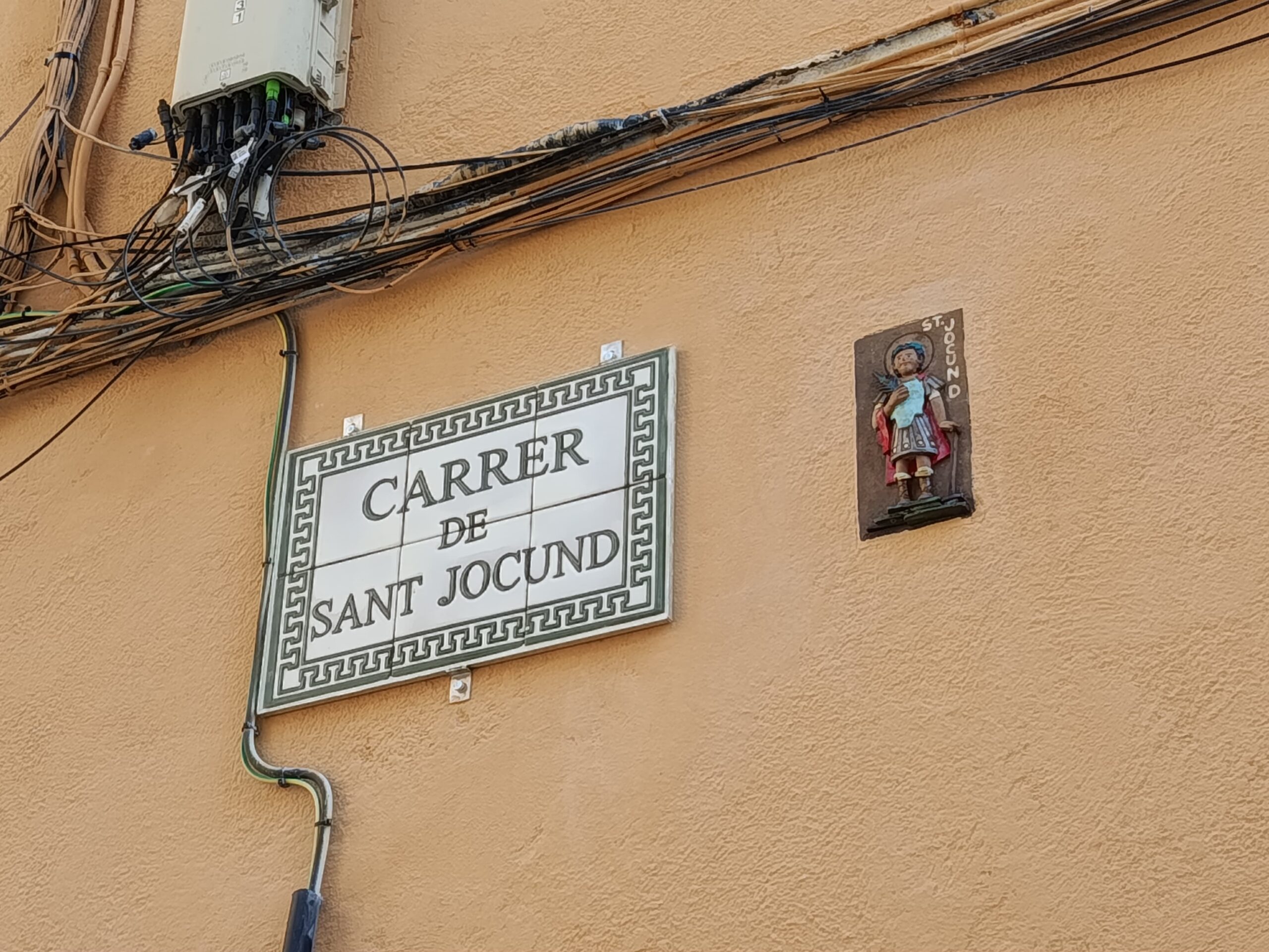 Una ceràmica amb la imatge de Sant Jocund llueix al costat de la placa amb el nom del carrer