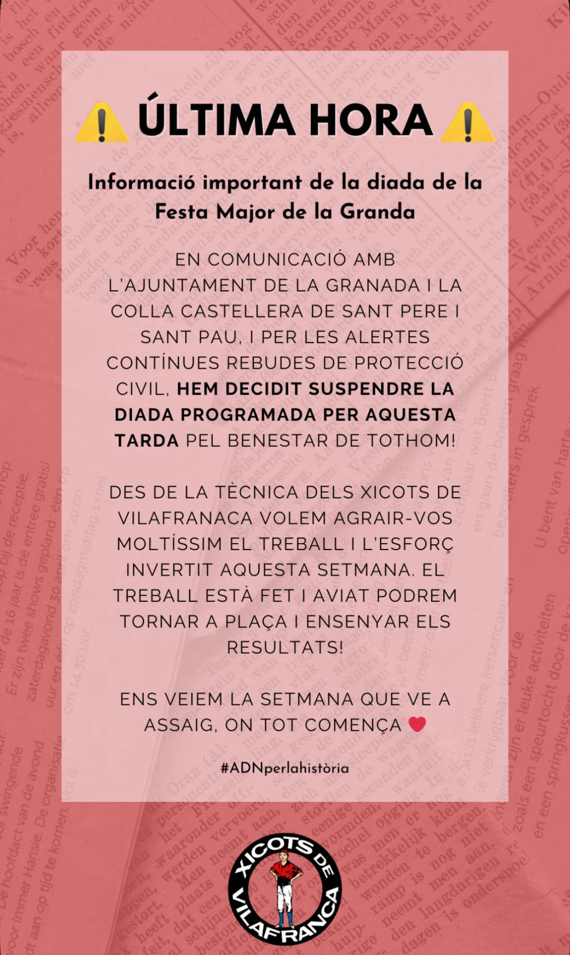 Comunicat sobre la diada castellera de la Festa Major de la Granada. Font: Xicots de Vilafranca