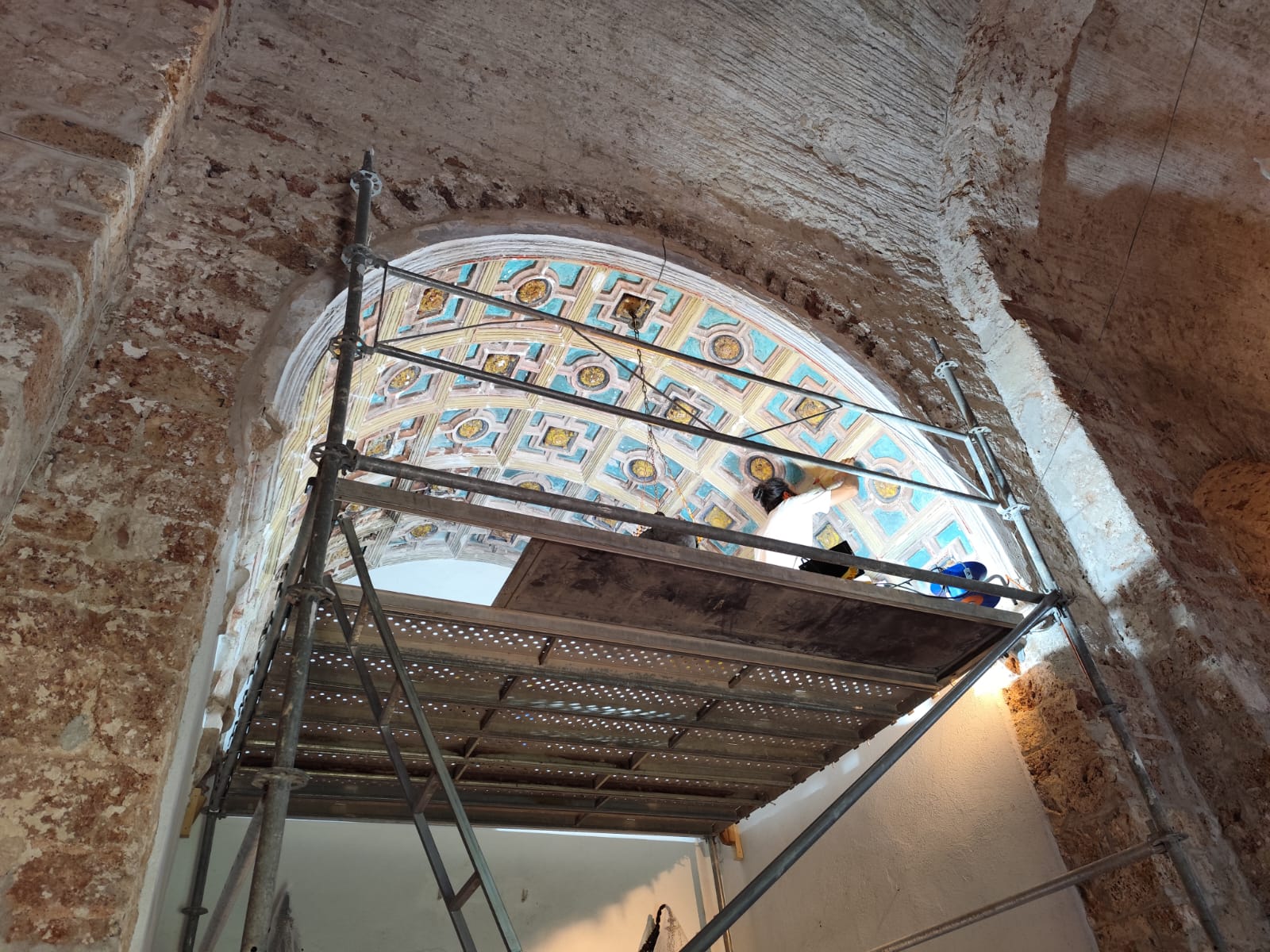 Tal i com explica Julià, els treballs se centren en la restauració del cassetonat de la capella de Sant Roc i de dues pintures murals policromades al tremp, datades entre els segles XVII i XVIII. Aleix Barberà és el restaurador que està fent les tasques de conservació de les pintures. Explica en què consisteixen els treballs al cassetonat.