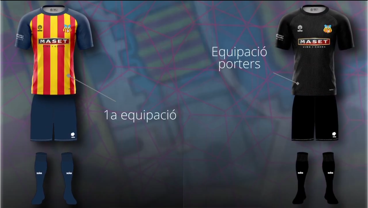 Precisament les quatre barres són innegociables, i part fonamental d’una samarreta que combina amb el blau marí que també llueixen els pantalons. La roba serà de la marca Soka; també l’equipació de porter, que serà clàssica, de color negre, amb un petit detall en una tonalitat més clara.