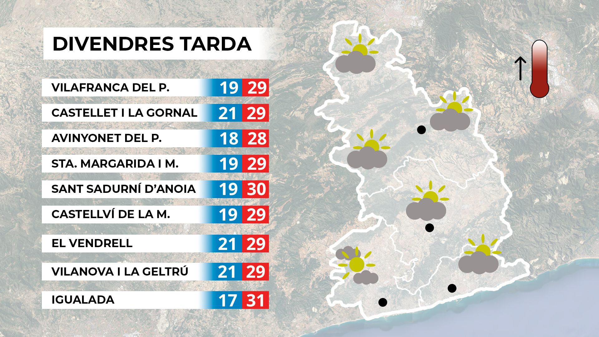 La fresca dels darrers dies arriba a la seva fi. Tot i això, la calor serà moderada i sense excessos. Aquest divendres a la tarda es preveu un temps tranquil, però amb un augment de la nuvolositat. Tot i la presència de núvols, el sol continuarà fent acte de presència, i els termòmetres ja fregaran els 30 graus.