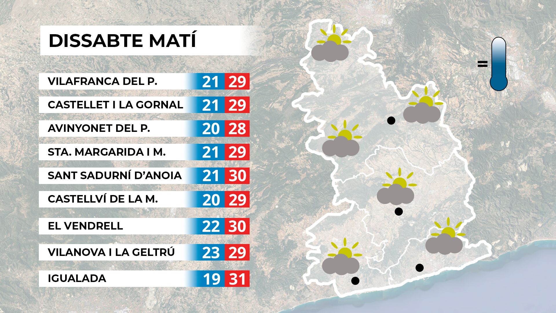 De cara a dissabte, el dia començarà amb més núvols i alguns plugims o ruixats aïllats, febles i poc generals, que podran arribar a mullar el terra. La sensació de fresca es farà notar a primera hora del matí.